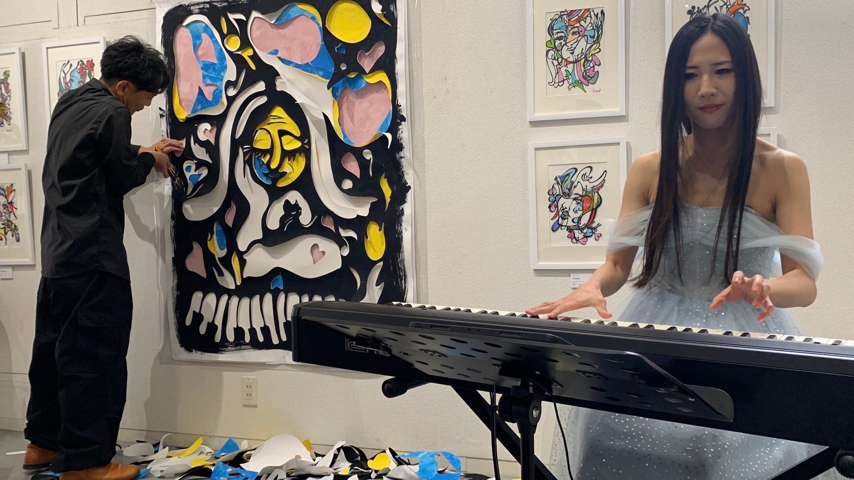 2013年より幾度もおこなってきたライブ。大きな切り絵を、様々なミュージシャンとともに