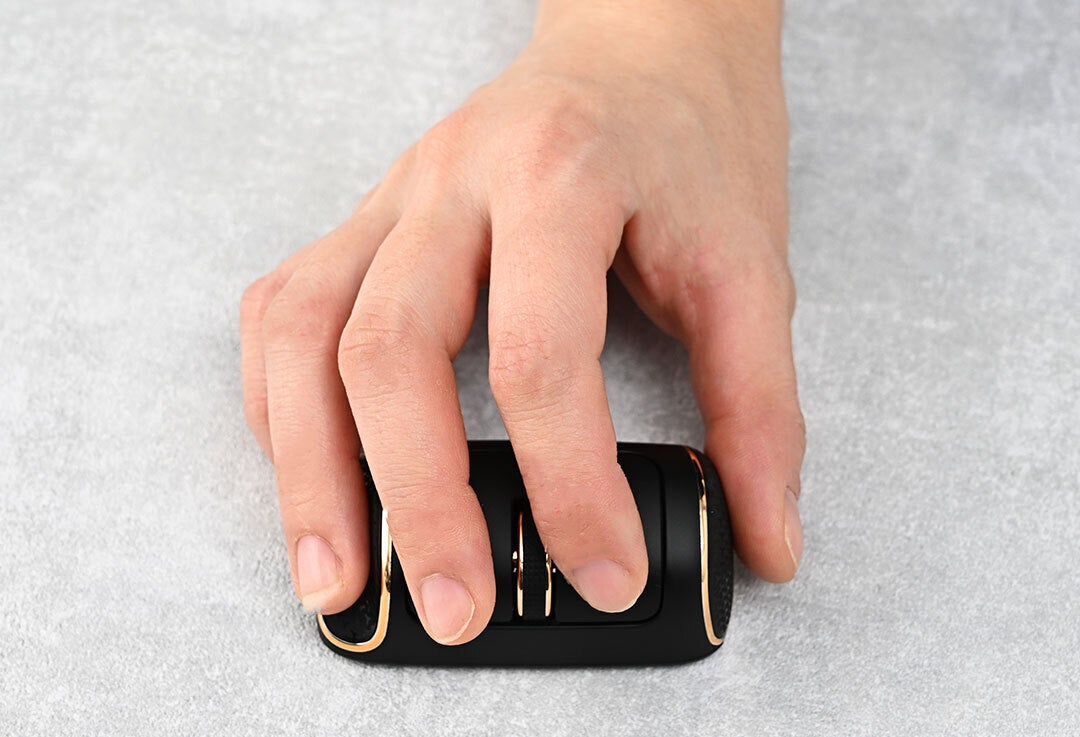 手の中で触れる邪魔な部分を大胆に無くし、薬指を置く所に凹みを作る事で無理のない自然な手の形でマウスを操作する事ができます。