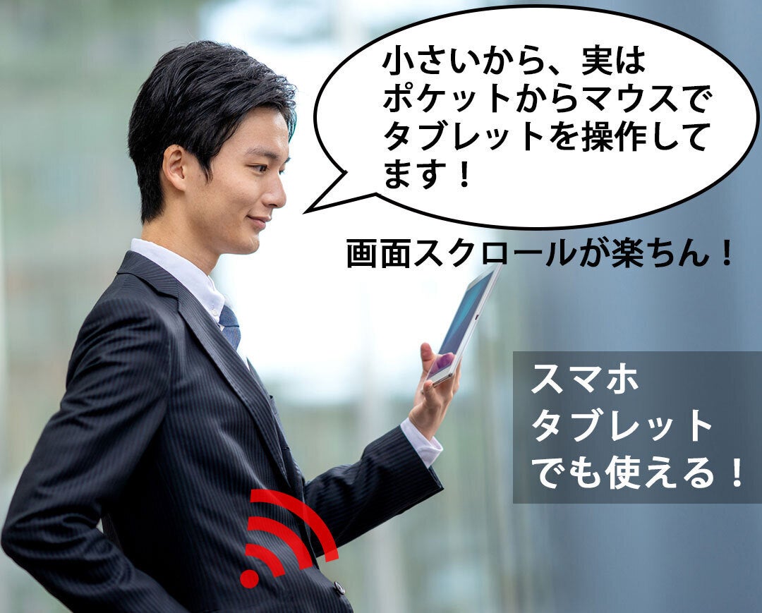 iphoneやiPad、Androidなどのスマホ、タブレットでもマウスが使えるので、満員電車内や寒い野外、街で立ったままタブレットの画面を見つつ、ポケットの中でマウスで操作!なんて使い方もできてしまいます。