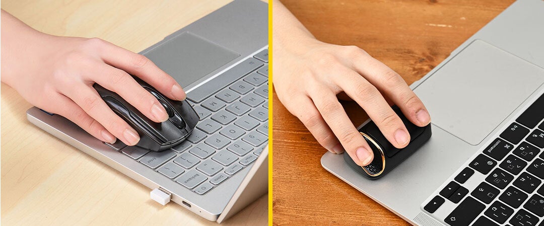指先の前後左右の動きでマウスが扱えるので、可動範囲が大幅に縮小!ノートパソコンの上や狭いスペースなど、僅かな幅でも問題なく使用できるようになっています。