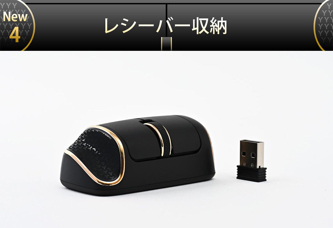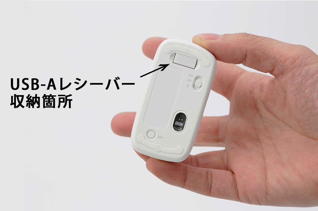2.4Ghzワイヤレス接続は、付属のUSB-Aレシーバーをパソコンやデバイスに挿す事で簡単に認識し接続されます。USBレシーバーを使用されない場合はマウス底部に収納が可能で、脱落や紛失を防ぐためマグネット方式で固定されます。