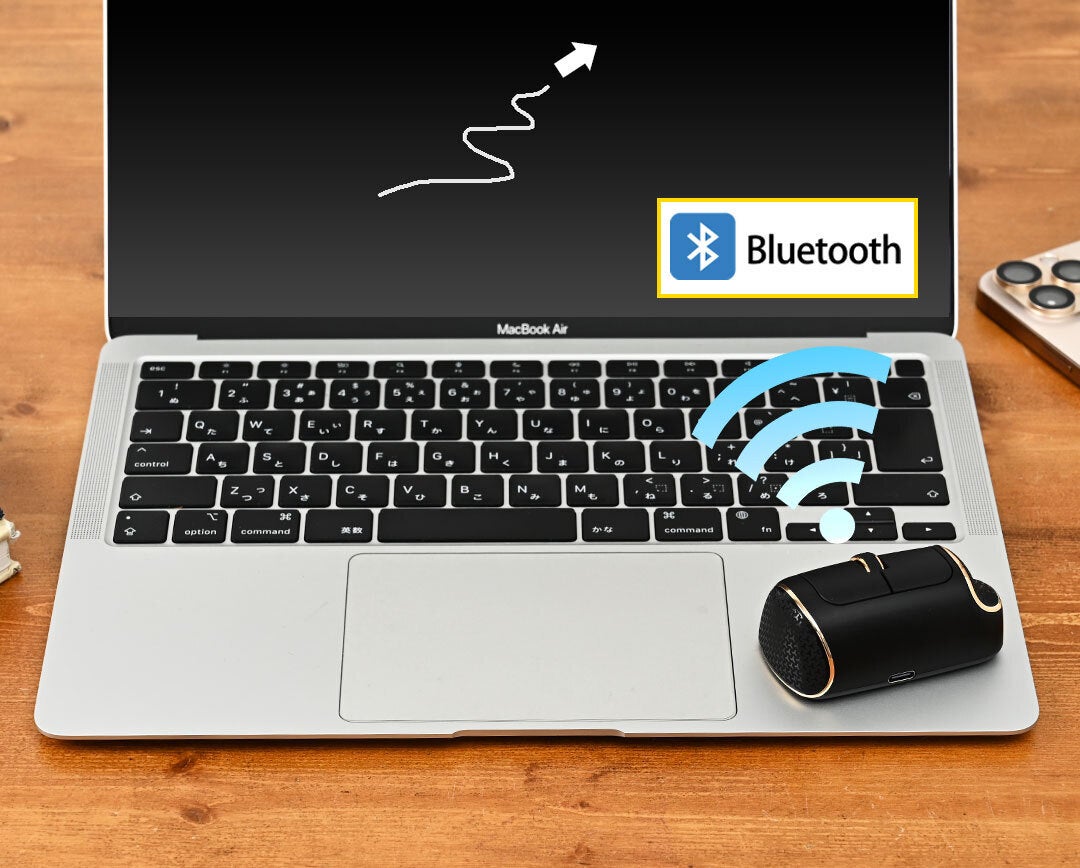 その場でマウスを前後左右に動かせるので可動範囲も大幅に縮小!持ち歩きも便利なコンパクトサイズなので、狭い新幹線や飛行機、カフェのテーブルなどでノートパソコンの上にマウスを置いて操作が可能、クリック音も周りに迷惑が掛からない静音設計です。