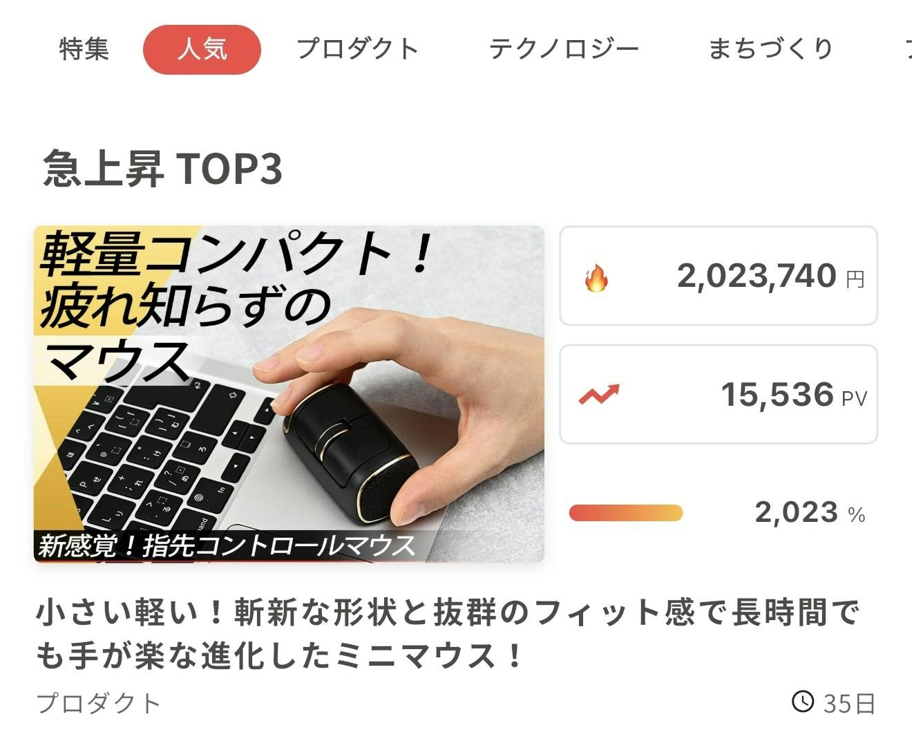 公開から多くの方にご支援頂いています、疲れ知らずのミニマウス「Finger Barrel Mouse i2」はお陰様で約300名様、200万円以上のご支援を頂き、人気ランキングNo.3にもランキング入りしました!心より感謝致します。