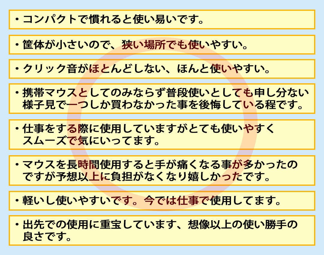 その場でマウスを前後左右に動かせるので可動範囲も大幅に縮小!持ち歩きも便利なコンパクトサイズなので、狭い新幹線や飛行機、カフェのテーブルなどでノートパソコンの上にマウスを置いて操作が可能、クリック音も周りに迷惑が掛からない静音設計です。