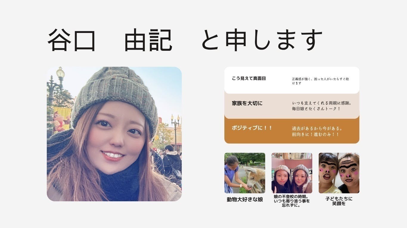 はじめまして。谷口と言います。ごく普通の家庭で育ち、わりと自由に生きてきました。思い立った時にやりたい事をする、そしてすぐ行動し向上心を持って何事にも取り組んで参りました。子どもが産まれてからは優先順位が変わり子どもの為に常に行動したくさんの愛情を注いできました。子育ては常に悩みも付き物で両親や友達に相談、アドバイスをもらいながら日々過ごしております。平凡に娘と過ごしてきましたがある時娘が不登校になりました。そんな時期もあり色々な事を考えていくうちに、自分がもっと出来る事があるような気がして進むべき道を明確にしようと決めプロジェクトを始めました。