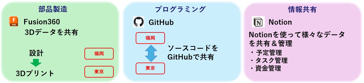 1000km離れたロボット開発なんて想像ができますか?私たちは今日にいたるまでロボット開発をお互いが1000km離れた福岡と東京を拠点として行ってきました。そんな遠距離開発を支えたのは近年話題のクラウド技術です。これによって、ロボットの3Dデータや、電子基板の概形、プログラムのソースコード、大会提出書類などのスムーズな共有、共同作業が実現できました。