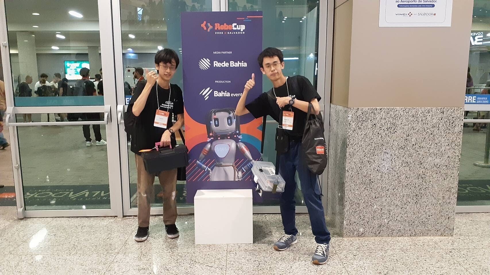 2025/08/12 11:51大会概要世界大会優勝を目指してブラジルサルヴァドール国際会議場で開催されたRoboCup 2025に出場してきました。RoboCupJunior Soccer部門は以下の日程で行われました。7/16:チェックイン、ロボット調整、ミーティング、オープニングセレモニー7/17:2 vs 2予選第1~第4試合7/18:2 vs 2予選第5~第7試合、ジュニアパーティー7/19:ポスター発表、インタビュー、スーパーチーム予選、Junior vs SSL7/20:スーパーチーム予選、テクニカルチャレンジ、アワードセレモニー競技の内容は下記の通りです。■2vs2コート上で自チーム2台、相手チーム2台の計4台で試合を行いました。■スーパーチーム3~4チームで合同チームを作成し、ひとまわり大きなコートで合同チーム同士の試合を行いました。■Junior vs SSL19歳まで参加できるジュニアリーグのロボットと20歳以上も参加できるメジャーリーグの中の1つの競技リーグであるSmall Size League (SSL)のロボットを対戦させる交流試合が行われました。■ポスター発表チームに関する情報をまとめたポスターを掲示して、他チーム、来場者と交流を行いました。■インタビュー3~4チームで自チームのアピールポイントを発表しあい、運営スタッフの方も交えて質疑応答を行いました。■テクニカルチャレンジ高電圧をキック機構に流して新型ボールをキックする、オープンリーグvsライトウェイトリーグなどいくつか与えられた課題から好きなものを選んで取り組みました。競技のほかにも7/18の夜にはパーティーが開催され、他チームと仲を深めました。結果<試合 予選>------------------------------------------------------------------2 vs 2:1勝2分4敗 (20/20位)スーパーチーム:1勝1分3敗 (5/5位)------------------------------------------------------------------------------------という大変悔しい結果になりました。◀ 敗因 ▶世界大会で出会ったロボットは以下の点で私たちと大きく異なっていました。● 強力なシュート私たちのロボットよりもよりストロークの大きくてキック力の高いプッシュ型ソレノイドを使用したキック機構を搭載していてコートの中央付近からでも正確なシュートを放っていた。● ボール保持機構ドリブラーというボールを保持する機構を使用し、ボールを押し出すのではなくつかむようにしてボールをゴールに運んでいた。特にスーパーチームではサッカーというよりはハンドボールのような試合だった。● スマートなビジョンユニット1台のカメラと高精度の全方位ミラーだけでボール等の探索を行っていた。この方法は高精度の全方位ミラーを自作するという高難度が必要であるが、キャリブレーションやプログラムを簡略化しやすいというメリットがある。また、私たちのロボットは次の点が課題でした。●モーターとタイヤの締結不足全国大会からモーターを変更したため、タイヤとモーターの締結方法が大きく変わった。以前はモーターにタップ(ネジ溝)が切られていてナットをはめて固定するという方法だったが、新しく採用したモーターがDカット軸であったためネジで軸を押さえつけて固定するという締結方法に変更した。この方法は脱輪の可能性が高く、事前の交流戦で実際に脱輪が起きていたため、ゆるみ止めを塗って対策を施し、ある程度の締結力を持たせることはできたが、個人がロボットを1台ずつ持っていてロボットが衝突しあうような環境での耐久力を十分確認することができず、実戦で脱輪が相次ぎ、締結力不足が露呈する結果となった。2 vs 2予選2日目により大きなネジとより強力なゆるみ止めを使用することにより試合前とハーフタイムにねじを締め直せば、脱輪が防げるぐらいに締結力を強化することができた。●自己位置推定アルゴリズムの不調初日の調整日に自己位置推定のプログラムがうまく動作していないことが判明した。このアルゴリズムはコート環境に依存するためプログラムの要因であるか環境の要因であるか特定することができず、コート外にロボットが出ることを防ぐプログラムを緊急で作成し、応急処置をしたがコート外に出て、ロボットがコートから多かった。のちに、大会前に福岡でロボットを組み上げた際に2台のUnitVカメラとメイン基板をつなぐ通信線が途中でクロスする誤配線をしていて、左右入れ替わったデータがメイン基板に送信されていたことが無線デバッグシステムからの取得データで判明した。●白線判別能力不足私たちのロボットには白線を検知するセンサーが周囲に16個ついており、少なくはないがメイン基板とつないでいる信号線が4本しかなく、その信号線の割り当ても前後左右というきれいな配置ではなく、右前、右後ろ・・・のような割り当てのため、白線の判別や、ゴールキーパーの白線のトレースに苦労した。また、ジュニアリーグvsメジャーリーグという大きなリーグをまたいだ交流戦でオープンリーグ機は勝つことはできませんでしたが接戦が繰り広げられ、スタッフの方が「皆さんがテクノロジーの大きな進歩を成し遂げている証です