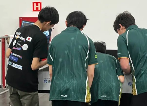 大会中には、練習フィールドで無線デバッグの実演をしたり、カメラでのボールやコートの探索方法を説明したり、チームで自作した小さなマイコンボードをデータシートと一緒に配布したりして他チームと交流を行いました。英語が苦手ということもあり、初めはうまく交流できるか不安でしたが英語に詰まったときは翻訳アプリも活用しながら積極的に交流に挑戦することができました。国内予選とは違い、試合後には握手をして軽く言葉を交わすなど互いをたたえあうこともありとても良い雰囲気でした。
