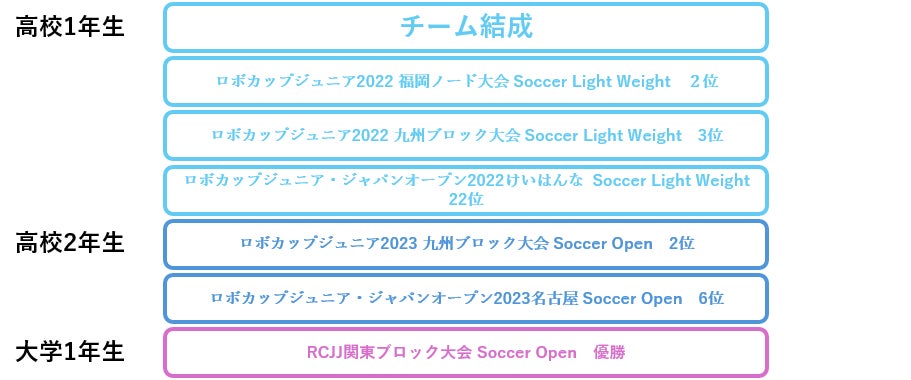もともとメンバー同士同じ高校の同じ部活。チームを組んでロボットを作って大会に出場し始めたのは高校1年生の時でした。当時は、赤外線を発光するボールをついせきする別の競技に出場していました。これまでの大会結果は下記のとおりです。