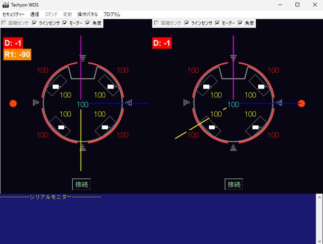 ロボットがボールを追跡中、誤作動したときにその原因をさぐるにはその時のロボットの状況を探ることが重要です。私たちのチームでは、ワイヤレスでロボットのモーターの出力や、センサの値、推測したボールの方向などを取得できるシステムの開発を行いました。ワイヤレス通信の部分には既製品の通信モジュールを使用して、ロボットの状況を映し出したり、ロボットに命令を送ったりする部分には自作のソフトウェアを導入しました。私たちのロボットに特化した独自のソフトウェアにより、スムーズな状況把握やロボットの調整につながりました。