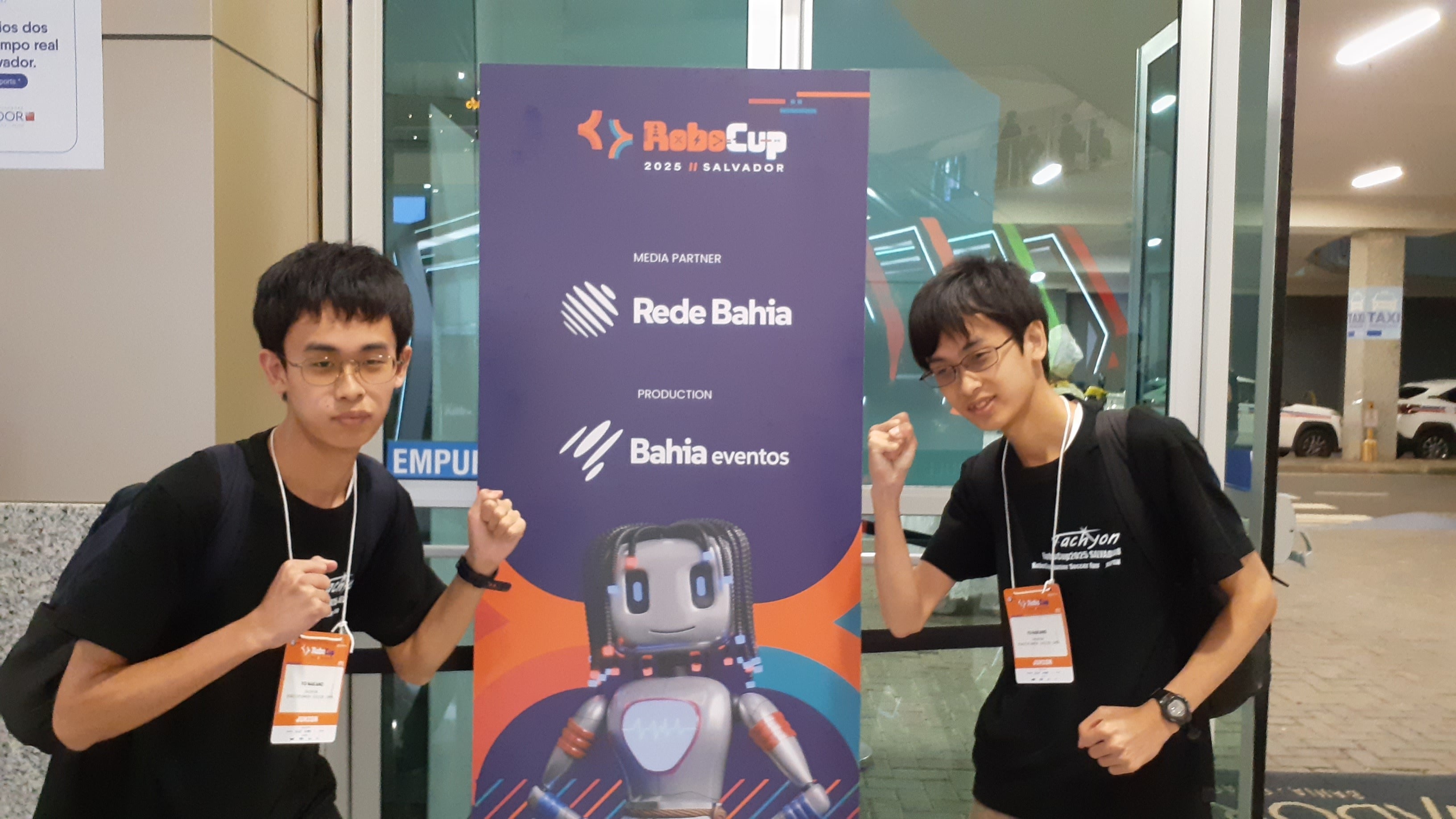 2025/08/12 11:51大会概要世界大会優勝を目指してブラジルサルヴァドール国際会議場で開催されたRoboCup 2025に出場してきました。RoboCupJunior Soccer部門は以下の日程で行われました。7/16:チェックイン、ロボット調整、ミーティング、オープニングセレモニー7/17:2 vs 2予選第1~第4試合7/18:2 vs 2予選第5~第7試合、ジュニアパーティー7/19:ポスター発表、インタビュー、スーパーチーム予選、Junior vs SSL7/20:スーパーチーム予選、テクニカルチャレンジ、アワードセレモニー競技の内容は下記の通りです。■2vs2コート上で自チーム2台、相手チーム2台の計4台で試合を行いました。■スーパーチーム3~4チームで合同チームを作成し、ひとまわり大きなコートで合同チーム同士の試合を行いました。■Junior vs SSL19歳まで参加できるジュニアリーグのロボットと20歳以上も参加できるメジャーリーグの中の1つの競技リーグであるSmall Size League (SSL)のロボットを対戦させる交流試合が行われました。■ポスター発表チームに関する情報をまとめたポスターを掲示して、他チーム、来場者と交流を行いました。■インタビュー3~4チームで自チームのアピールポイントを発表しあい、運営スタッフの方も交えて質疑応答を行いました。■テクニカルチャレンジ高電圧をキック機構に流して新型ボールをキックする、オープンリーグvsライトウェイトリーグなどいくつか与えられた課題から好きなものを選んで取り組みました。競技のほかにも7/18の夜にはパーティーが開催され、他チームと仲を深めました。結果<試合 予選>------------------------------------------------------------------2 vs 2:1勝2分4敗 (20/20位)スーパーチーム:1勝1分3敗 (5/5位)------------------------------------------------------------------------------------という大変悔しい結果になりました。◀ 敗因 ▶世界大会で出会ったロボットは以下の点で私たちと大きく異なっていました。● 強力なシュート私たちのロボットよりもよりストロークの大きくてキック力の高いプッシュ型ソレノイドを使用したキック機構を搭載していてコートの中央付近からでも正確なシュートを放っていた。● ボール保持機構ドリブラーというボールを保持する機構を使用し、ボールを押し出すのではなくつかむようにしてボールをゴールに運んでいた。特にスーパーチームではサッカーというよりはハンドボールのような試合だった。● スマートなビジョンユニット1台のカメラと高精度の全方位ミラーだけでボール等の探索を行っていた。この方法は高精度の全方位ミラーを自作するという高難度が必要であるが、キャリブレーションやプログラムを簡略化しやすいというメリットがある。また、私たちのロボットは次の点が課題でした。●モーターとタイヤの締結不足全国大会からモーターを変更したため、タイヤとモーターの締結方法が大きく変わった。以前はモーターにタップ(ネジ溝)が切られていてナットをはめて固定するという方法だったが、新しく採用したモーターがDカット軸であったためネジで軸を押さえつけて固定するという締結方法に変更した。この方法は脱輪の可能性が高く、事前の交流戦で実際に脱輪が起きていたため、ゆるみ止めを塗って対策を施し、ある程度の締結力を持たせることはできたが、個人がロボットを1台ずつ持っていてロボットが衝突しあうような環境での耐久力を十分確認することができず、実戦で脱輪が相次ぎ、締結力不足が露呈する結果となった。2 vs 2予選2日目により大きなネジとより強力なゆるみ止めを使用することにより試合前とハーフタイムにねじを締め直せば、脱輪が防げるぐらいに締結力を強化することができた。●自己位置推定アルゴリズムの不調初日の調整日に自己位置推定のプログラムがうまく動作していないことが判明した。このアルゴリズムはコート環境に依存するためプログラムの要因であるか環境の要因であるか特定することができず、コート外にロボットが出ることを防ぐプログラムを緊急で作成し、応急処置をしたがコート外に出て、ロボットがコートから多かった。のちに、大会前に福岡でロボットを組み上げた際に2台のUnitVカメラとメイン基板をつなぐ通信線が途中でクロスする誤配線をしていて、左右入れ替わったデータがメイン基板に送信されていたことが無線デバッグシステムからの取得データで判明した。●白線判別能力不足私たちのロボットには白線を検知するセンサーが周囲に16個ついており、少なくはないがメイン基板とつないでいる信号線が4本しかなく、その信号線の割り当ても前後左右というきれいな配置ではなく、右前、右後ろ・・・のような割り当てのため、白線の判別や、ゴールキーパーの白線のトレースに苦労した。また、ジュニアリーグvsメジャーリーグという大きなリーグをまたいだ交流戦でオープンリーグ機は勝つことはできませんでしたが接戦が繰り広げられ、スタッフの方が「皆さんがテクノロジーの大きな進歩を成し遂げている証です