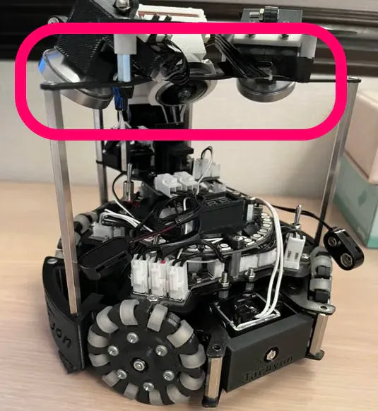 ロボット上部に取り付けられた3つのカメラ。試合中や、ロボットの車検、インタビューの際には多くのスタッフや審判の方々の目を引きました。また、大会側からは「魚眼レンズを活用した革新的なビジョンシステムを開発し実用化した」とうれしいご好評をいただきました。