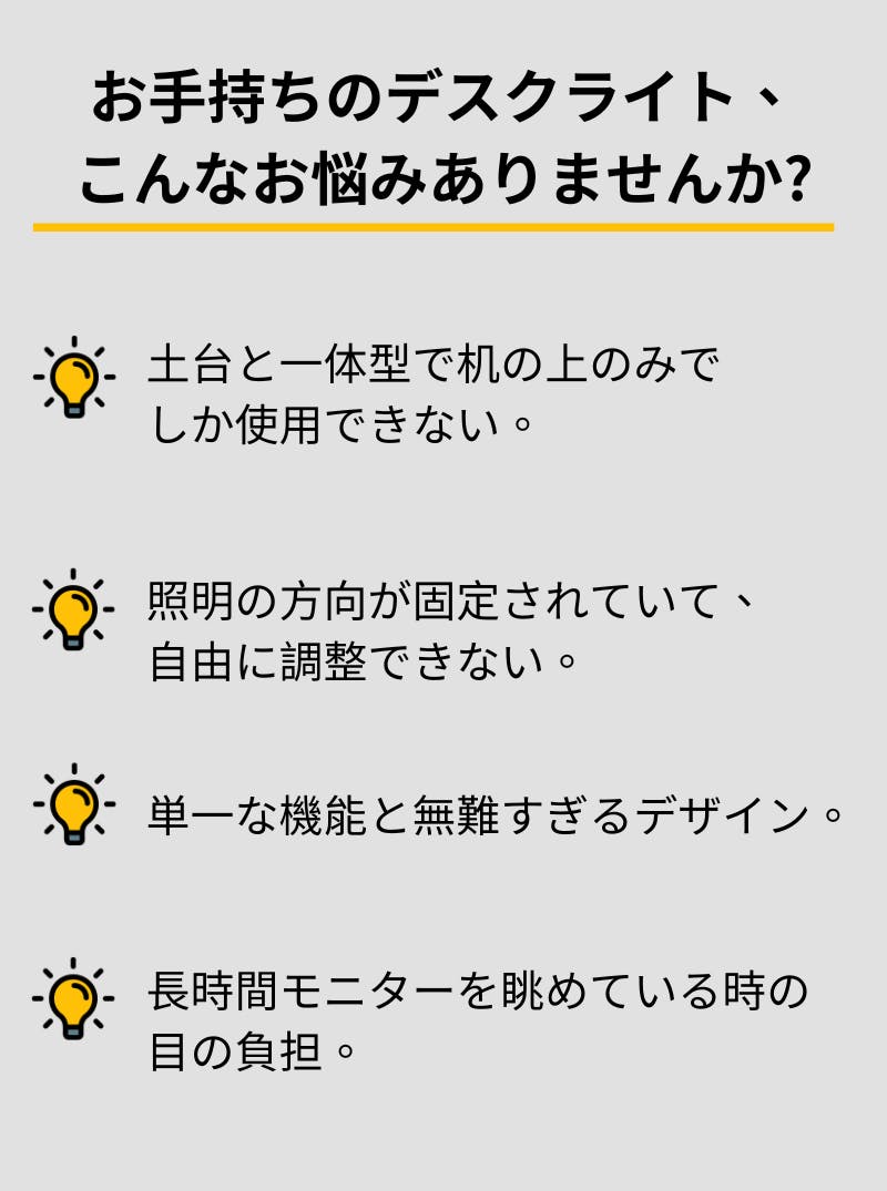 製品のご購入時からご購入頂いた後まで、常に+αの付加価値提供を追求しています。今後もサポーターの皆様が笑顔になる製品をお届けしてまいります。今回紹介させていただく「Boring Lamp」はこの名前から想像もできないほど多機能なライトです。デスクやモニターを明るく照らすだけでなく、音楽と連動したり、ハンドライトになったり、日常そのものを明るくします。オフィスとご家庭に楽しみをプラスしたい皆様にぜひこの製品を体験していただければ幸いです。