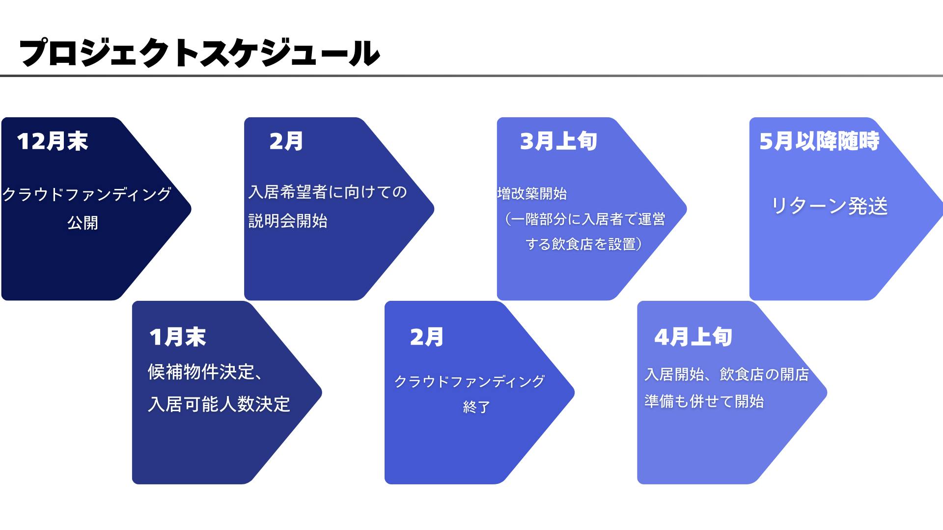 4月上旬 入居開始、飲食店の開店準備も併せて開始 5月以降随時 リターン発送