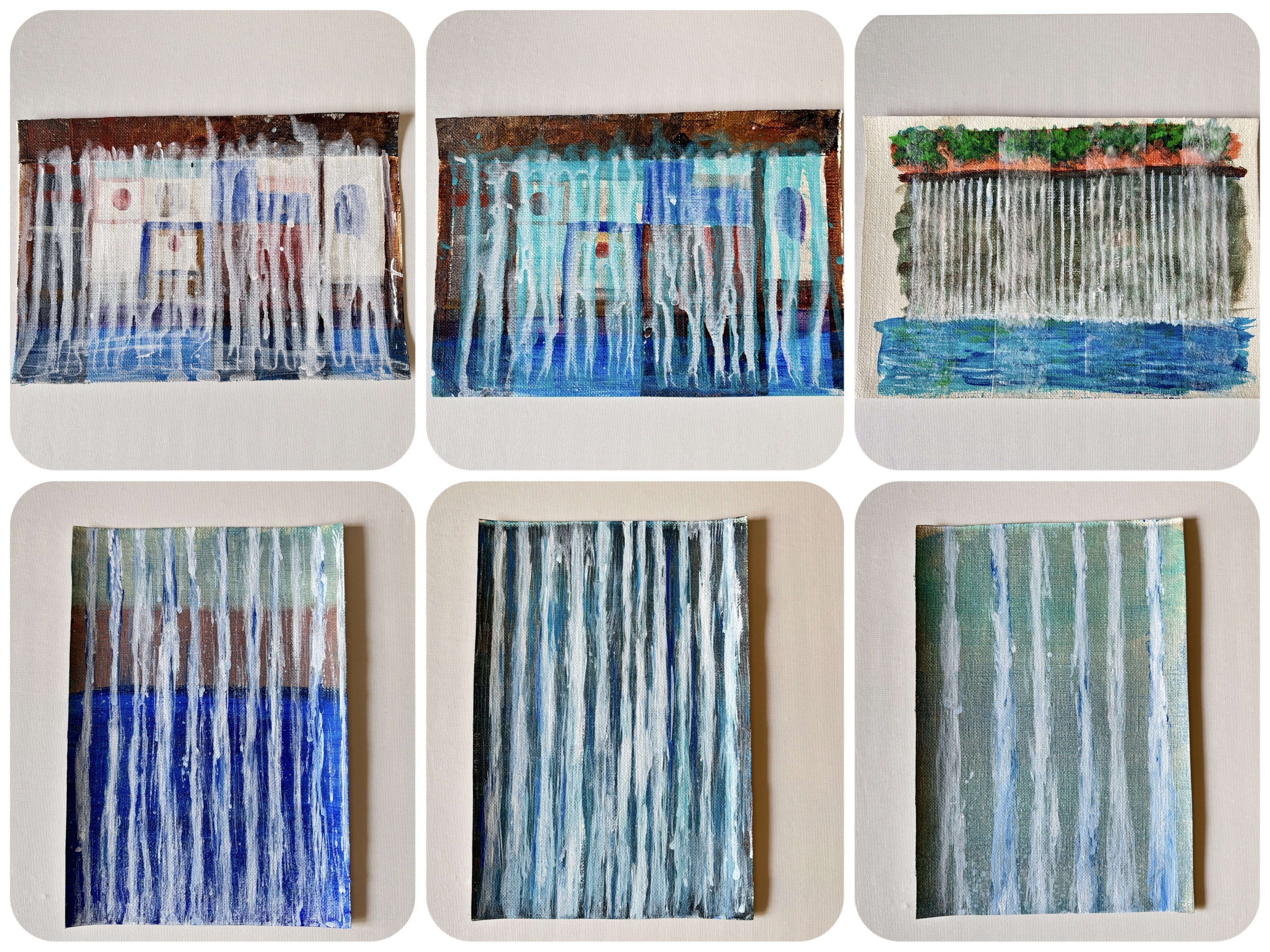 カーテンのような滝を表現するために、テストピースを6枚作成しました。滝の作品と言えば、千住博氏の「THE FALL 」。以前、特集で観た絵の具を垂らす方法をお手本に、先ずはテストピースを作りました。白糸らしさが表現できそうなノズルを幾つか用意し、滴り具合をテスト。白だけでは表情がとぼしかっだので、ブルーを加えたりしましたが、上手くいきませんでした。そもそも表現したいものに違いがあるので、同じ手法ではどうやら無理な事に気がつきました。背景の透かし具合をコントロールしながら、偶発的なタッチも欲しい。かつ、白糸の間や太さも狙いたい。 そうなるとやっぱり筆かなと思い、次に、細い筆を使ってテストしました。ところが、今度は整然となり過ぎてしまいました。たどり着いたのは、扇筆でした。扇筆を弾ませながら描くとで、滝の表情を作りつつ、透かし具合を調整することができました。