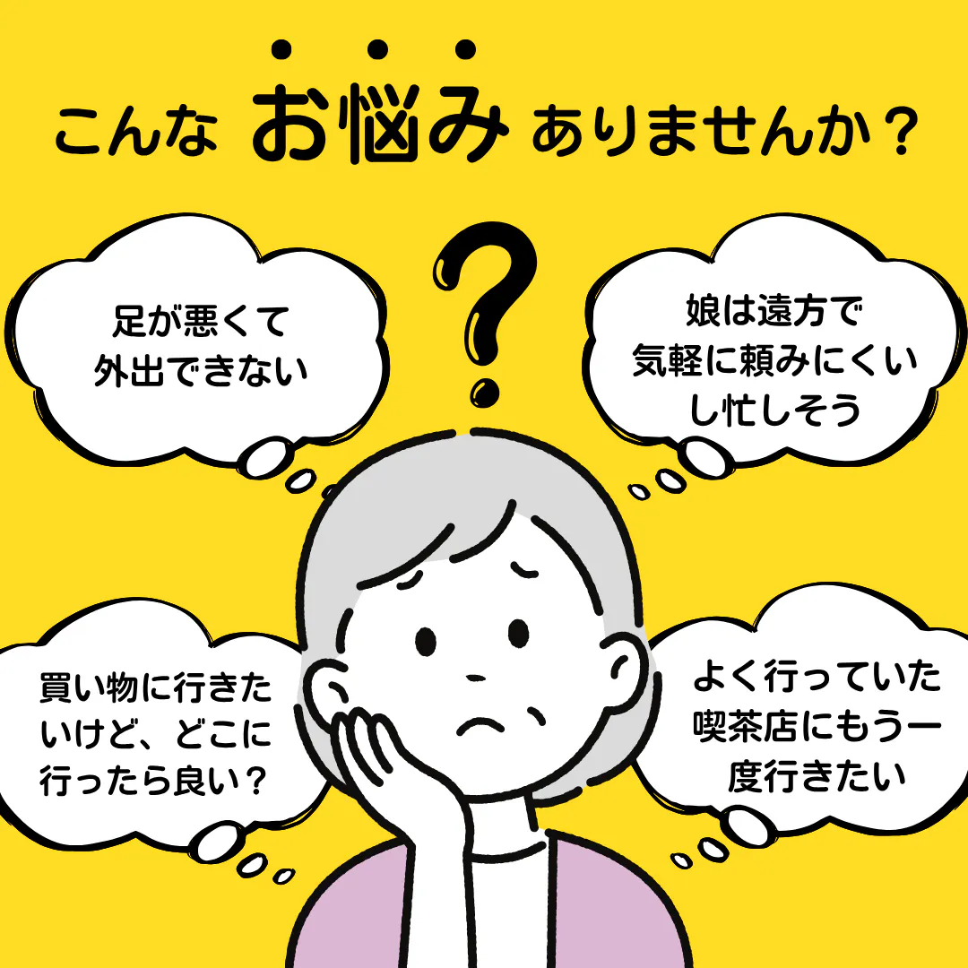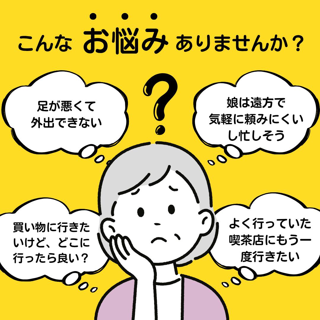 「車椅子なので一人では移動が難しい」「家の外に行くには一人では不安」等のお悩みを抱えている方がおられたら、ぜひご相談ください。
