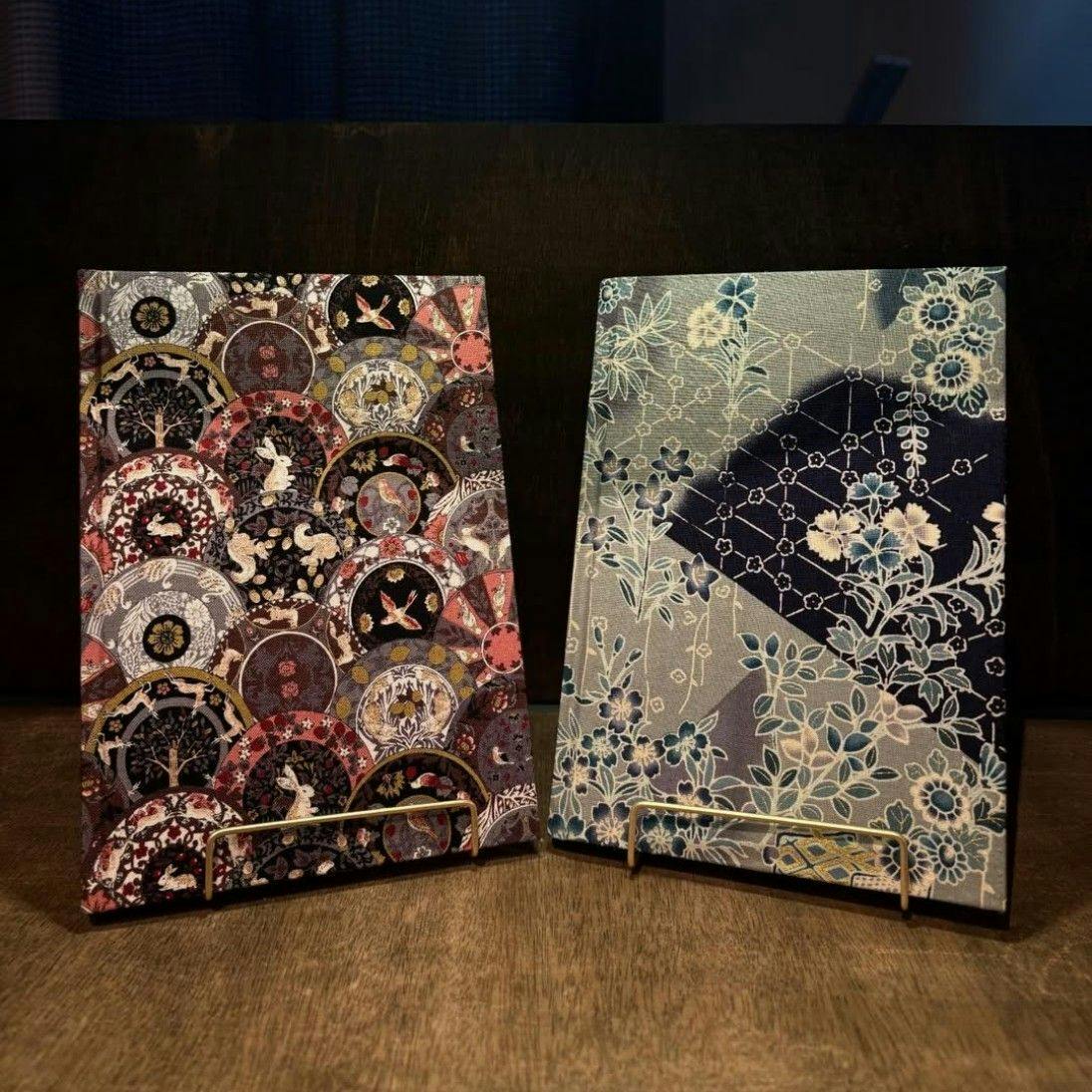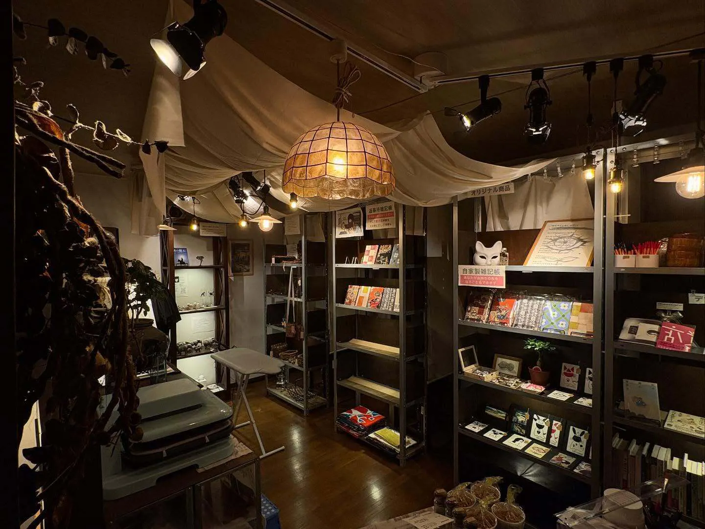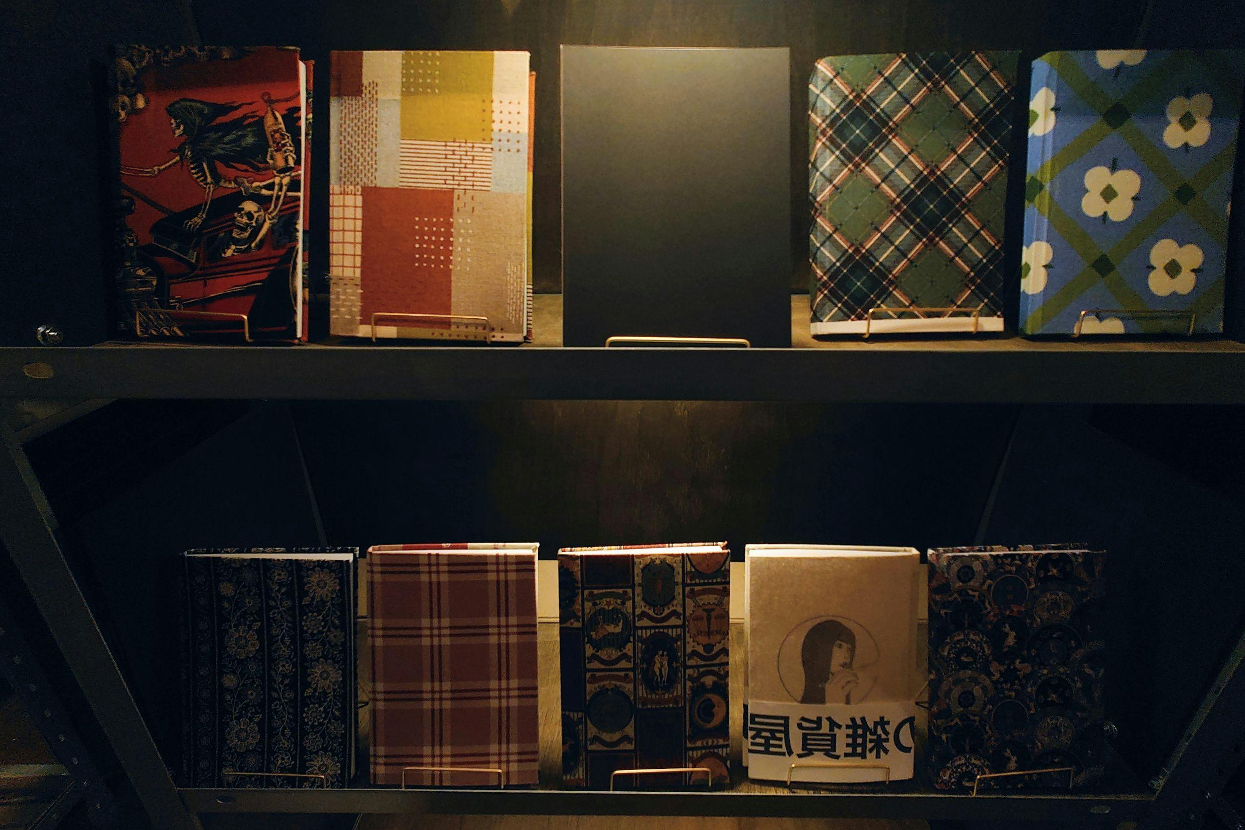 隣の棚には、市販の生地(著作権クリア済)を使って仕立てた自家製雑記帳をはじめ、店長や店主が描き下ろしたオリジナル商品が並んでいます。また縁のある作家さんたちの作品も展示販売しております。
