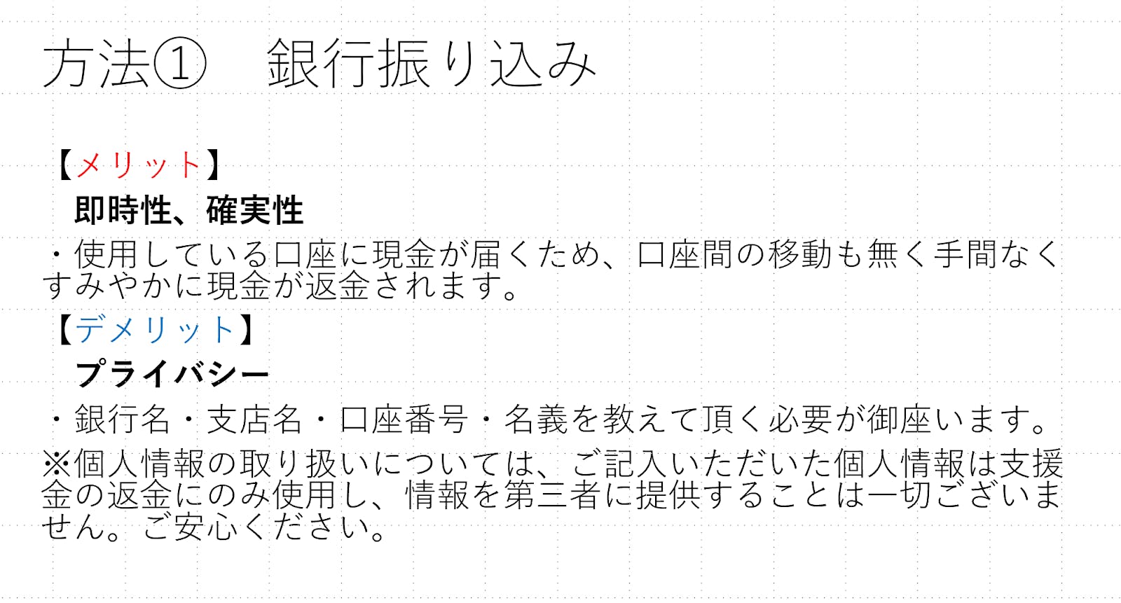 つきましては、既に支援者様の方に同様の内容の個別メッセージをお送りさせていただきましたが、下記の返金方法をご提案させていただきました。