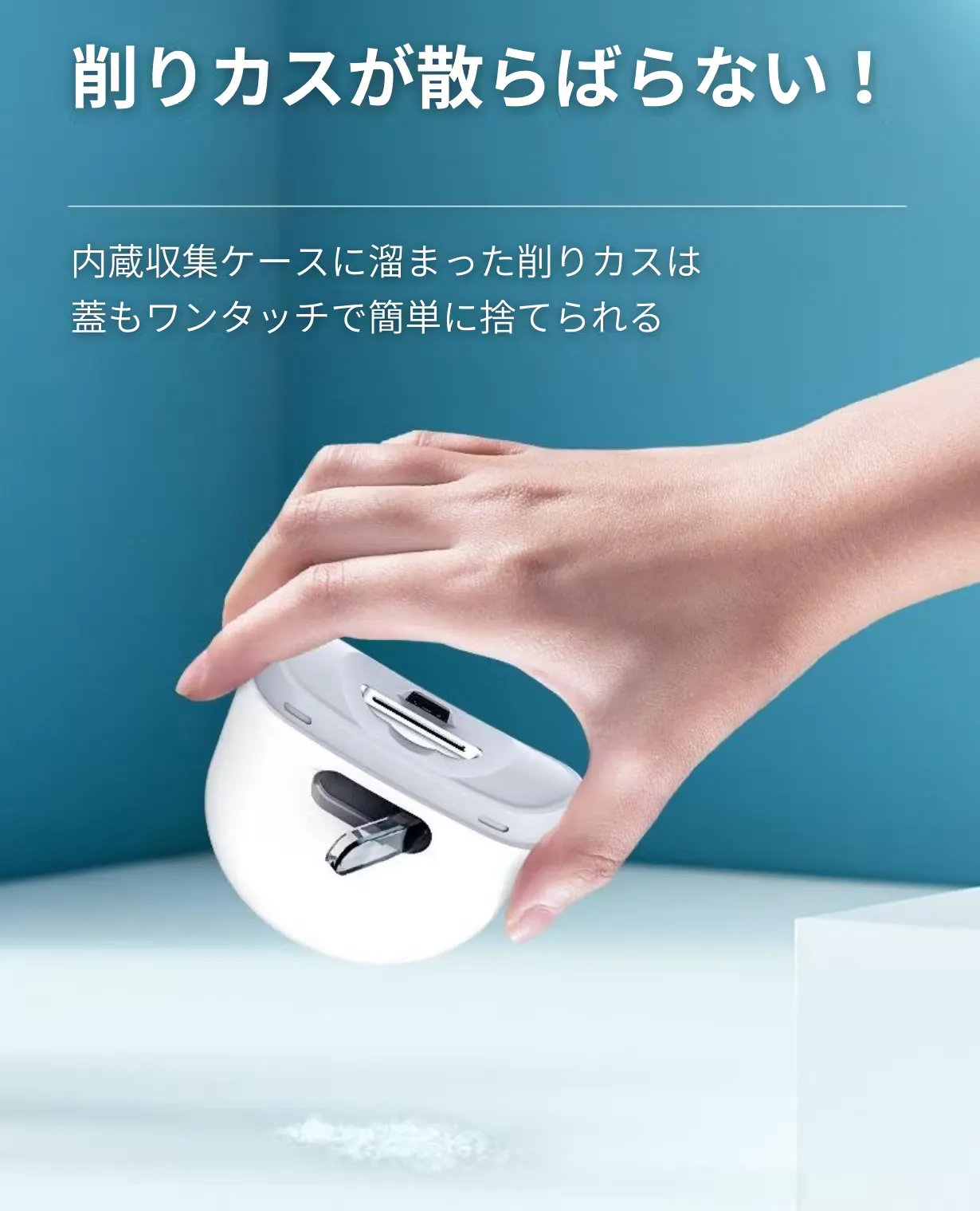 削った爪クズが溜まる内蔵収集ケース搭載で、削りカスが飛び散らず簡単に集めることができます。