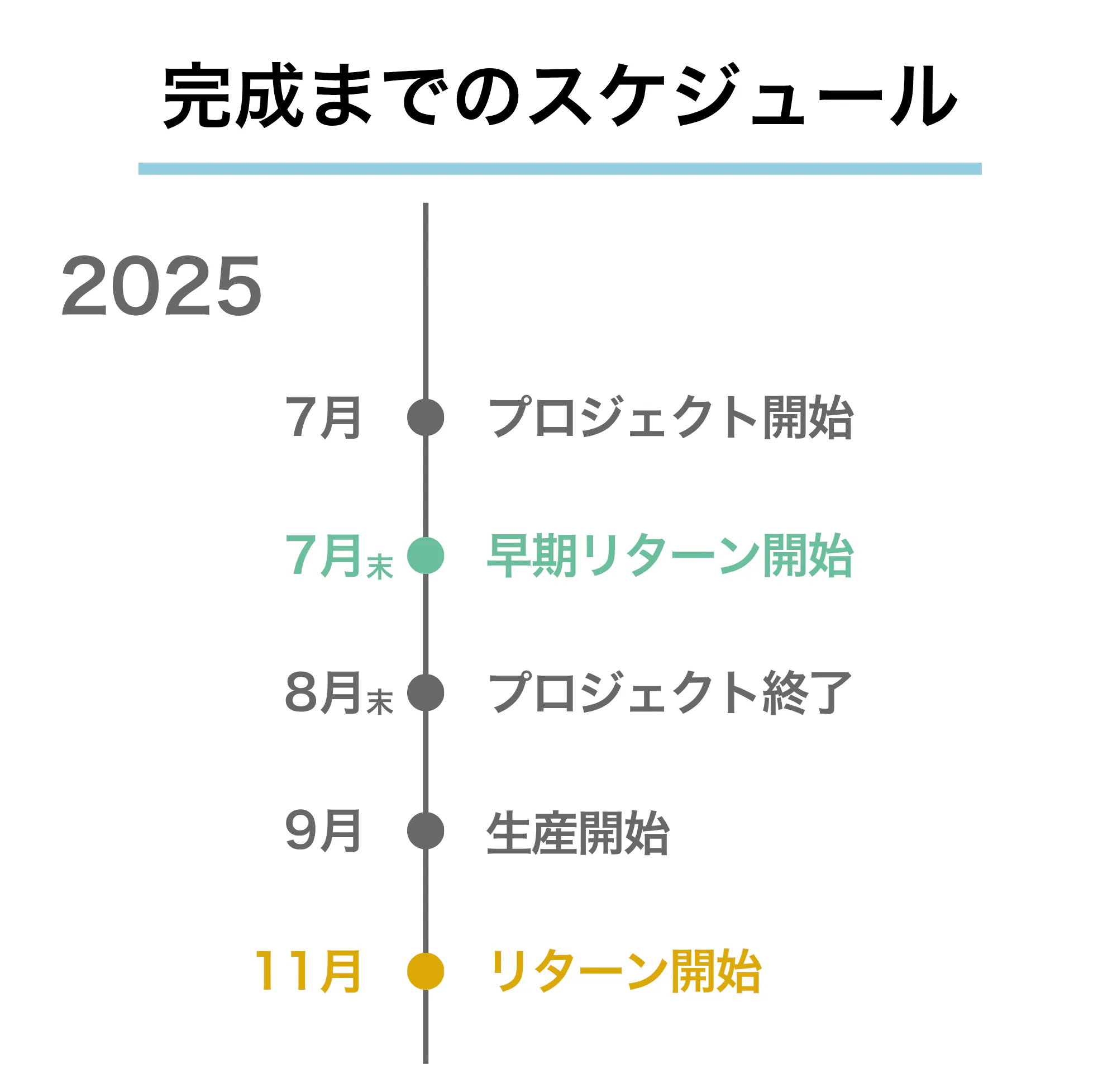 ※本文中に記載させていただいたスケジュールは、あくまでプロジェクト公開時点の予定です。クラウドファンディングを経て輸入を行う性質上、配送遅延のおそれがございます。