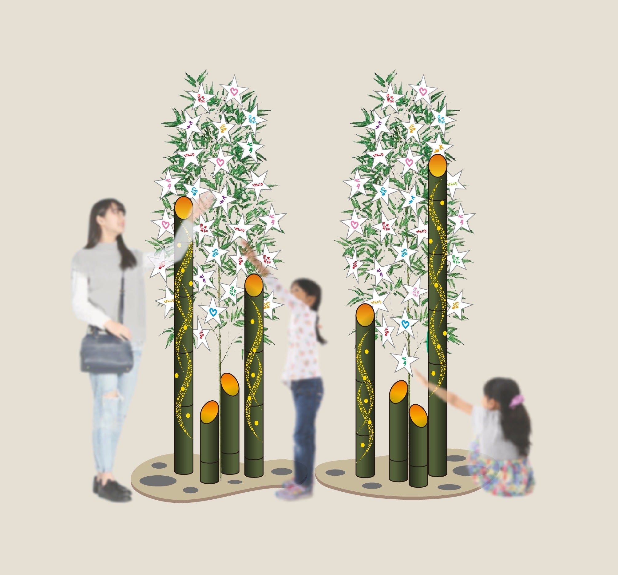 あなたの願いが、展示の一部となり、竹あかりに照らされ、人工流れ星とともに空を流れる。