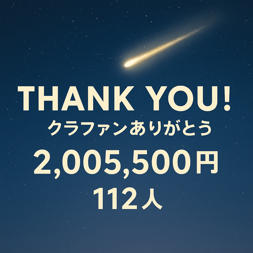 2025/08/01 09:45クラウドファンディング、無事に終了いたしました!最終的に、112人の方から合計2,005,500円のご支援をいただきました。本当に、本当にありがとうございました。短冊に願いを込めてくださった方、メッセージをくださった方、シェアで応援してくださった方、そして静かに見守ってくださった方。このプロジェクトは「流れ星を待つ仲間づくり」だと、私たちは思っています。みなさんと出会えたことが、何よりの成果です。大阪・関西万博での展示も、多くの方々に足を運んでいただき、大きな反響をいただきました。「やっぱり、たくさんの人が流れ星を見たいと思ってくれている」そう実感できたことが、私たちにとって何よりの励みとなりました。これから、人工流れ星を流す日に向けて、準備の様子や、プロジェクトの進捗など、いろいろとご報告していきますね。楽しみにしていてください。Xアカウントでも随時会社の取り組みを発信してまいりますのでフォローいただけると大変嬉しいです!引き続き、どうぞよろしくお願いいたします。 もっと見る万博での展示 無事終わりました