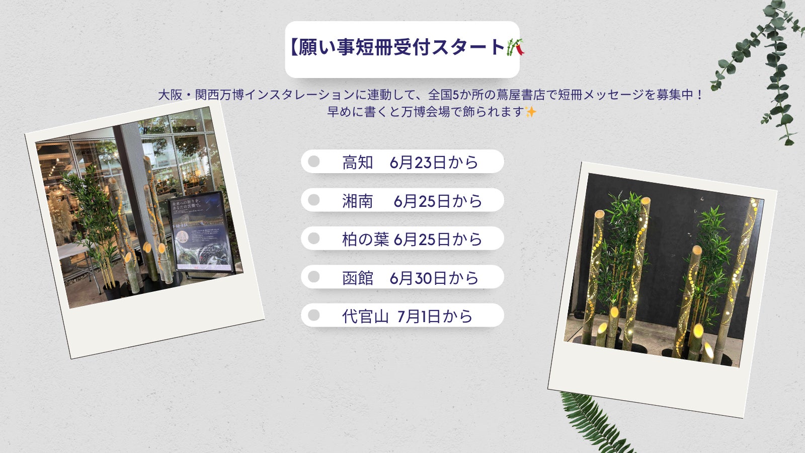 【願い事短冊受付スタート】大阪・関西万博インスタレーションに連動して、全国5か所の蔦屋書店で短冊メッセージを募集中!早めに書くと万博会場で飾られます高知 6/23〜湘南 6/25〜柏の葉 6/25〜函館 6/30〜代官山 7/1〜あなたの想いを夜空へ。#短冊 #EXPO2025
