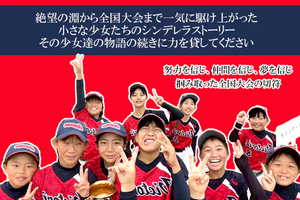 このプロジェクトは、そんな彼女たちのシンデレラストーリーの第2章——全国大会への挑戦を、皆さまに応援して頂き、感動を共に味わって頂きたく、その大会に損化するため必要な資金のご支援をお願いするものです。