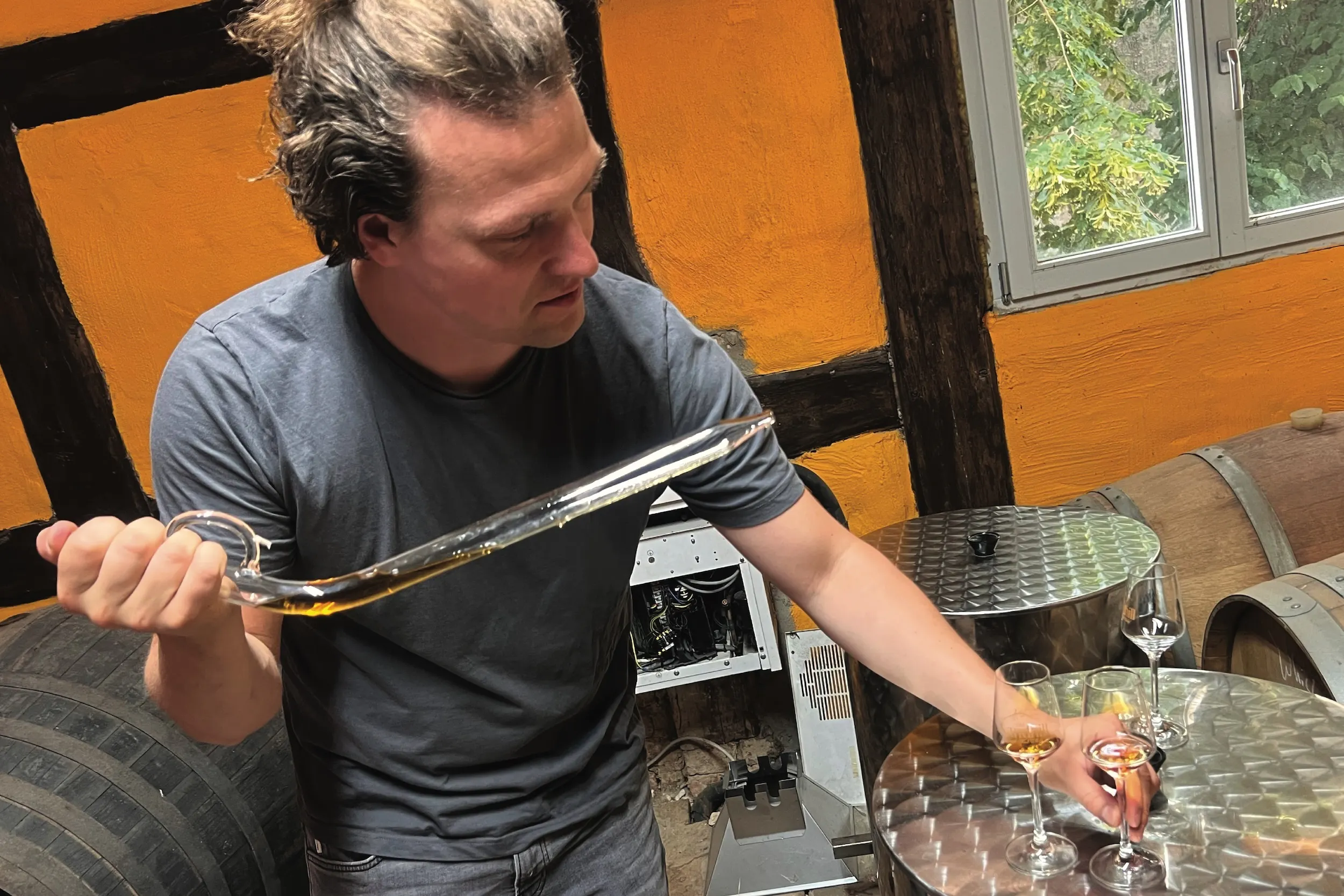 一度味わえば忘れられない美味しさのオールドサンドヒルのビオ・ビール、蒸溜所では樽から直接注いでくれた。