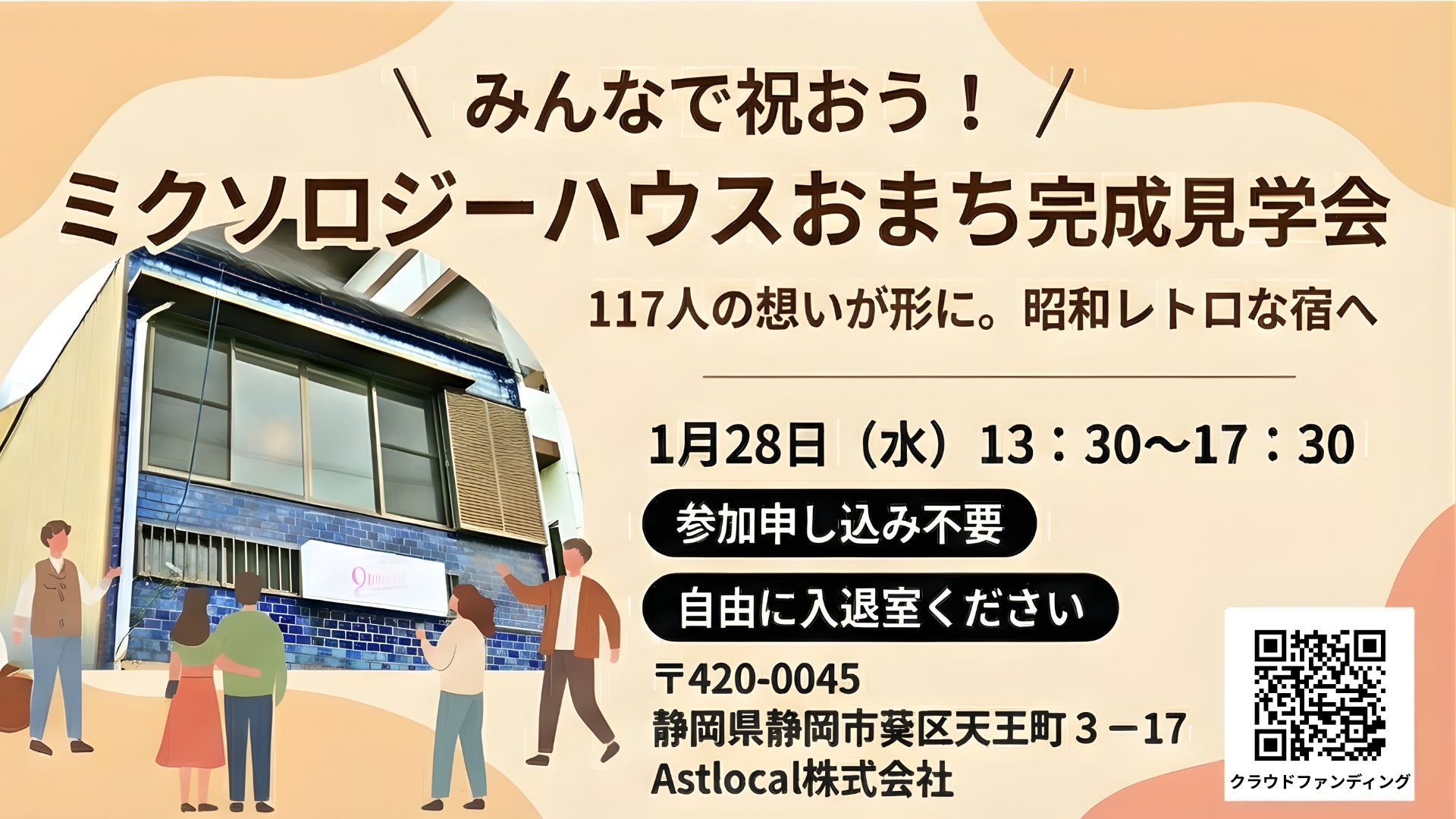 こんにちは!Astlocalの山本です。3月21日に開始した「ミクソロジーハウスしみず」のクラウドファンディング、大切なご報告をさせてください。■ 目標金額100万円、達成しました▼ ミクソロジーハウスしみず プロジェクトページhttps://mixology-shimizu.vercel.app/支援者数:64名支援総額:1,077,000円(目標100万円の107%)皆さまのおかげで、目標金額を達成することができました。ふじや、おまちに続く3棟目の挑戦。3回目とはいえ、毎回不安は変わりません。それでもこうして目標に届いたのは、これまでのプロジェクトから応援し続けてくださっている皆さまの存在があったからです。心から感謝しています。本当にありがとうございます。■ なぜ、3棟目は「清水」なのか清水港には年間を通じて大型客船が寄港し、国内外から多くの旅行者が訪れます。しかし現実には、その多くが御殿場アウトレットや箱根といった近隣の観光地へ流れてしまい、清水で過ごす時間はほんのわずかです。サッカーの街。ちびまる子ちゃんのふるさと。エスパルスの本拠地。河岸の市の新鮮な海鮮、久能山東照宮、久能のいちご狩り、三保の松原。清水には全国に通用するコンテンツが揃っているのに、「泊まって、味わって、また来たい」と思ってもらえる受け皿がまだ足りていません。Astlocalのメンバー4人のうち2人は清水の出身です。子どもの頃から慣れ親しんだこの町が、年々元気を失っていく姿を見てきました。清水区では空き家の増加が深刻な課題になっています。放置された空き家は景観を損ない、防災・防犯上のリスクにもなります。私たちは「空き家を減らし、より安全で快適な街にしていく」ために、使われなくなった住宅を宿泊施設として再生する道を選びました。今、清水は大きく変わろうとしています。新サッカースタジアムの建設、区役所の移転、再開発の動き。この流れの中で「観光」という切り口から清水を盛り上げたい。用宗と天王町で積み上げたノウハウを、地元・清水に還元する。それが3棟目「ミクソロジーハウスしみず」の原点です。■ 「宿がまちを動かす」。ふじやで確信に変わりました「ローカルを観光で強くする」。この想いのもと、2023年にAstlocal株式会社を設立しました。1年で2,000件以上の物件を検討し、最初にたどり着いたのが用宗の築90年の古民家「ふじや」です。CAMPFIREで245人の方から507万円のご支援をいただき、左官イベントには100名以上の方が参加してくれました。ゲストが宿を起点に地元の食堂やカフェを訪れ、地域にお金が回り始める。開業7ヶ月で稼働率90%超を達成し、「宿がまちを動かす」という仮説が確信に変わりました。2棟目「おまち」では開始3日で100万円に到達。「つくって終わり」ではなく、宿泊者を地元商店街や観光スポットへつなぎ、地域全体を元気にしていくモデルを実践しています。そしてこの3棟目「しみず」。「Mixology(ミクソロジー)」とは、さまざまな人・コト・文化が混ざり合うこと。宿を起点に、旅行者が地元の海鮮や観光名所に足を運び、地域にお金が循環する。私たちの子どもの世代がこの町で暮らしていく未来のために、「清水って面白い町だよね」と胸を張れるまちづくりを、一歩ずつ進めていきます。■ 残り3日。リターン枠のご案内クラウドファンディングは4月3日(金)をもって終了します。目標は達成しましたが、リターンの枠はまだ残っています。・応援コース(3,000円):制限なし・スポンサーボード シルバー(15,000円):残り13枠/30枠・ふじや年間収支データ(15,000円):残り1枠/10枠・スポンサーボード ゴールド(30,000円):残り13枠/20枠・スポンサーボード プラチナ(99,000円):残り1枠/5枠・視察ツアー(100,000円):残り3組/3組スポンサーボードは、しみずの壁に永年掲載されます。ふじや・おまちでボードを掲載してくださった方、しみずにも名前を並べてみませんか。3棟すべてに名前が入ったら、それはもう「アストローカルの歴史の一部」です。ふじやの年間収支データは残り1枠です。民泊のリアルな経営数値に興味がある方はお早めにご検討ください。プラチナスポンサーも残り1枠。最も目立つ位置に、最大サイズで永年掲載される枠です。■ お願い残り3日です。「気になっていたけどまだだった」という方がいらっしゃいましたら、ぜひこの機会に覗いてみてください。また、周りに民泊や地方創生、スポンサーボードに興味がありそうな方がいらっしゃれば、このページをシェアしていただけるだけでも大きな力になります。ふじやの245人、おまちの117人。これまで362人の方に支えていただきながら、ここまで来ることができました。3棟目のしみずも、最後まで走り切ります。引き続き、よろしくお願いいたします。▼ ミクソロジーハウスしみず プロジェクトページhttps://mixology-shimizu.vercel.app/▼ InstagramはこちらからインスタページAstlocal株式会社 山本