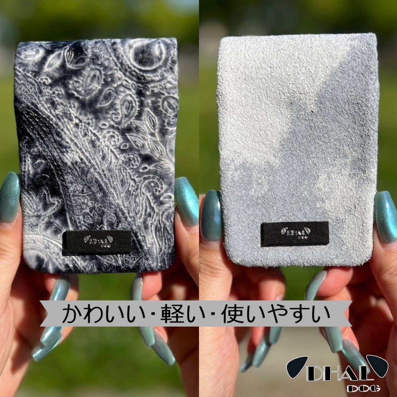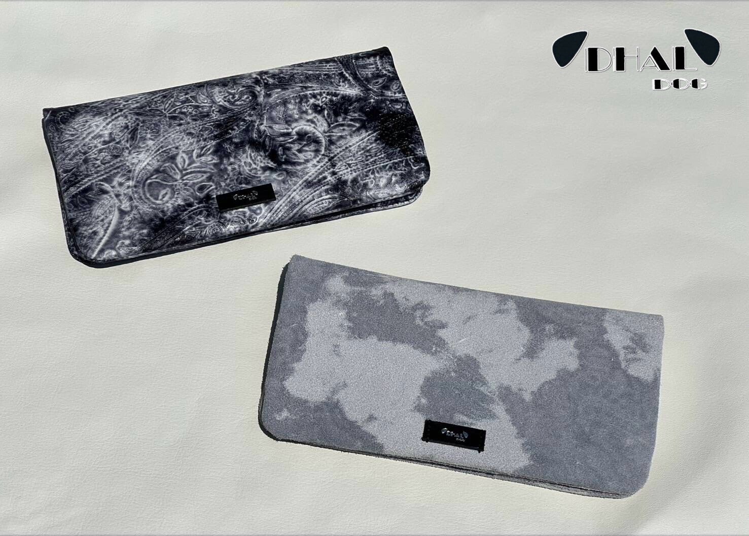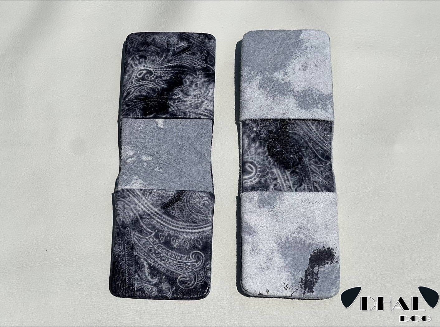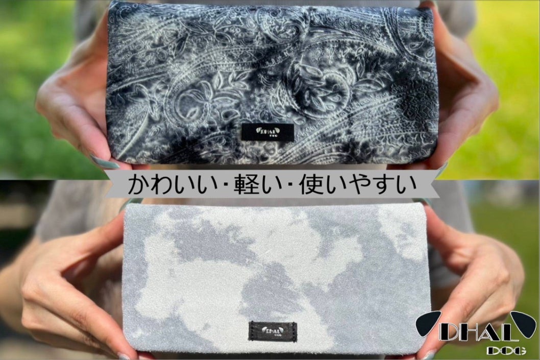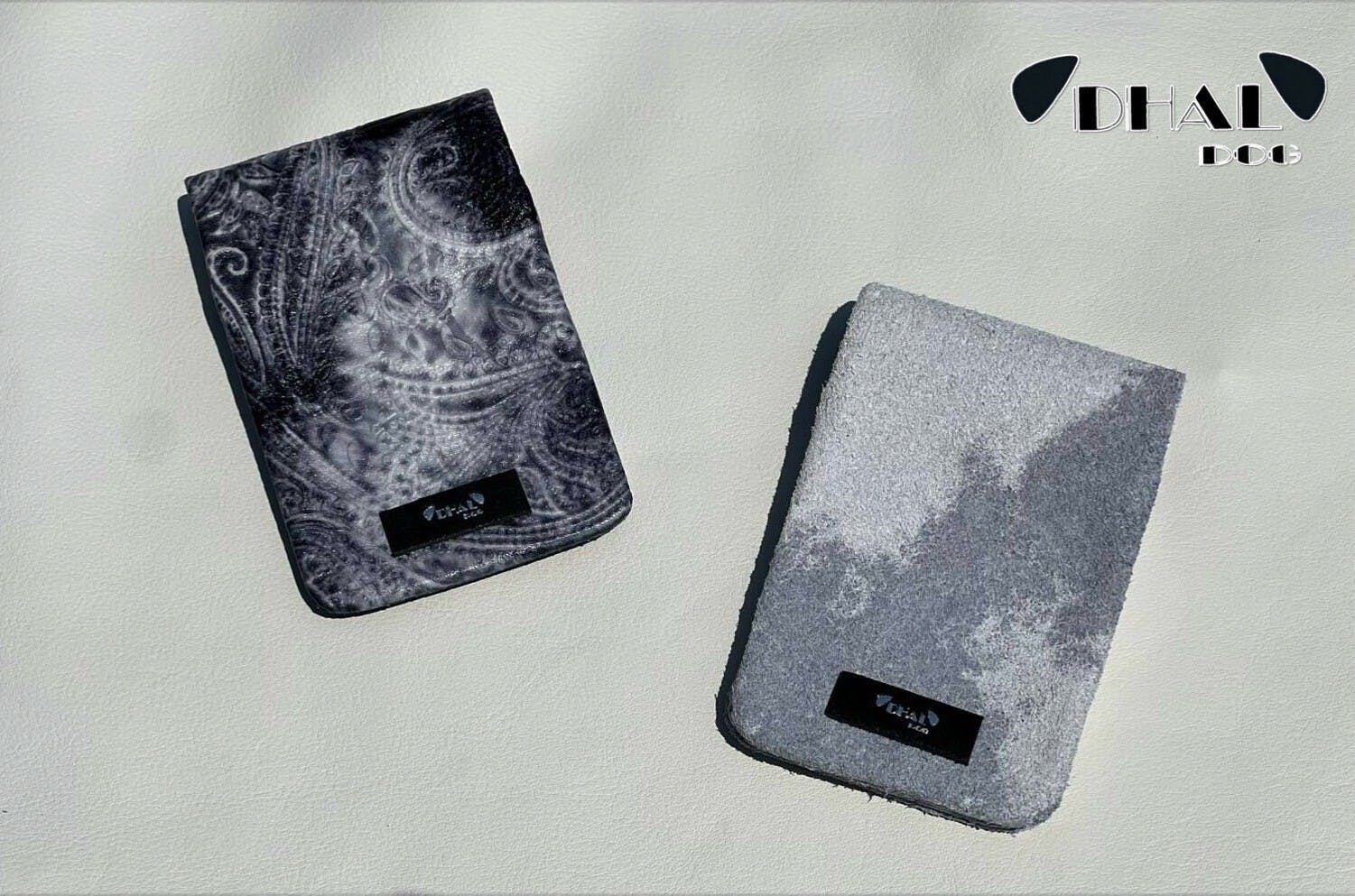 今回、「DHAL.DOG」の革の特徴であるダルメシアンカラー(裏)を使いロングウォレットとカードケースを製作しました。