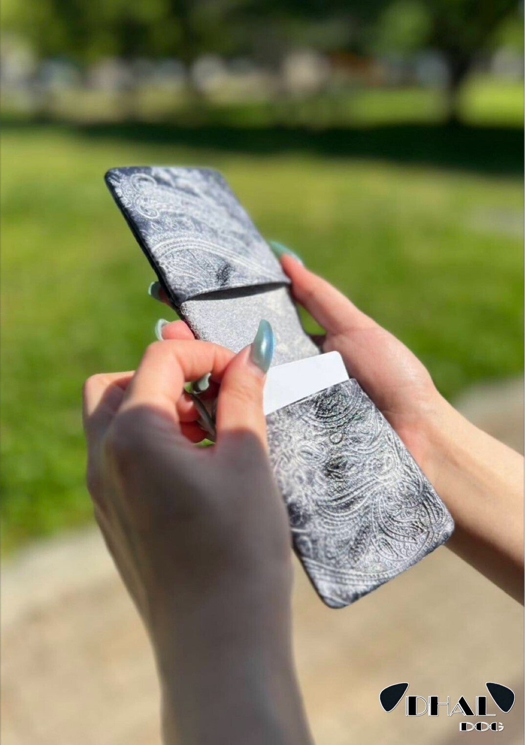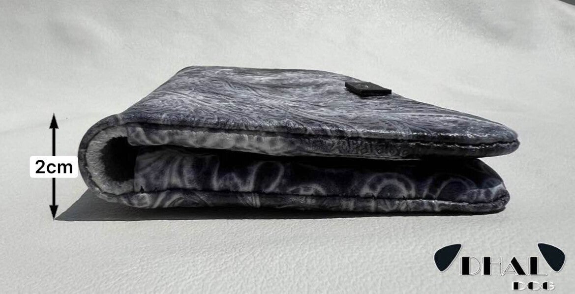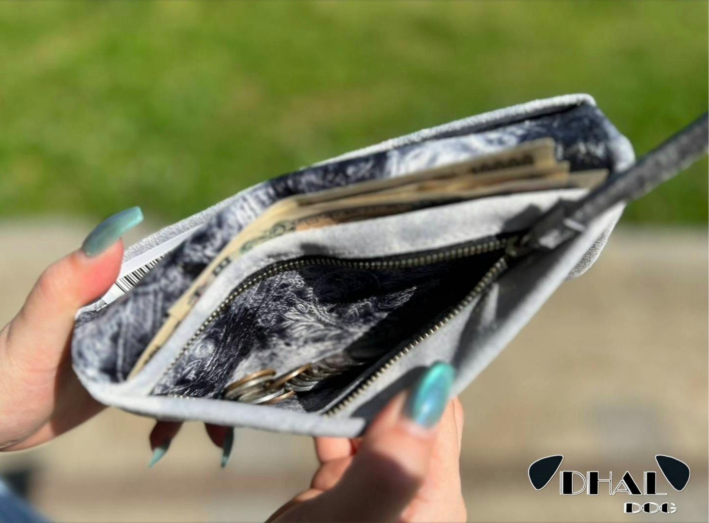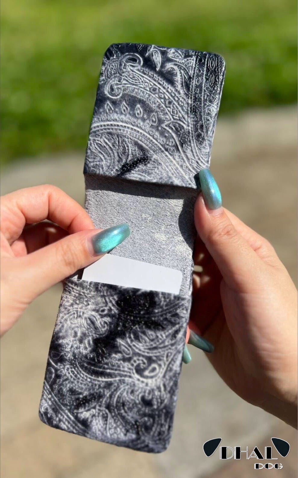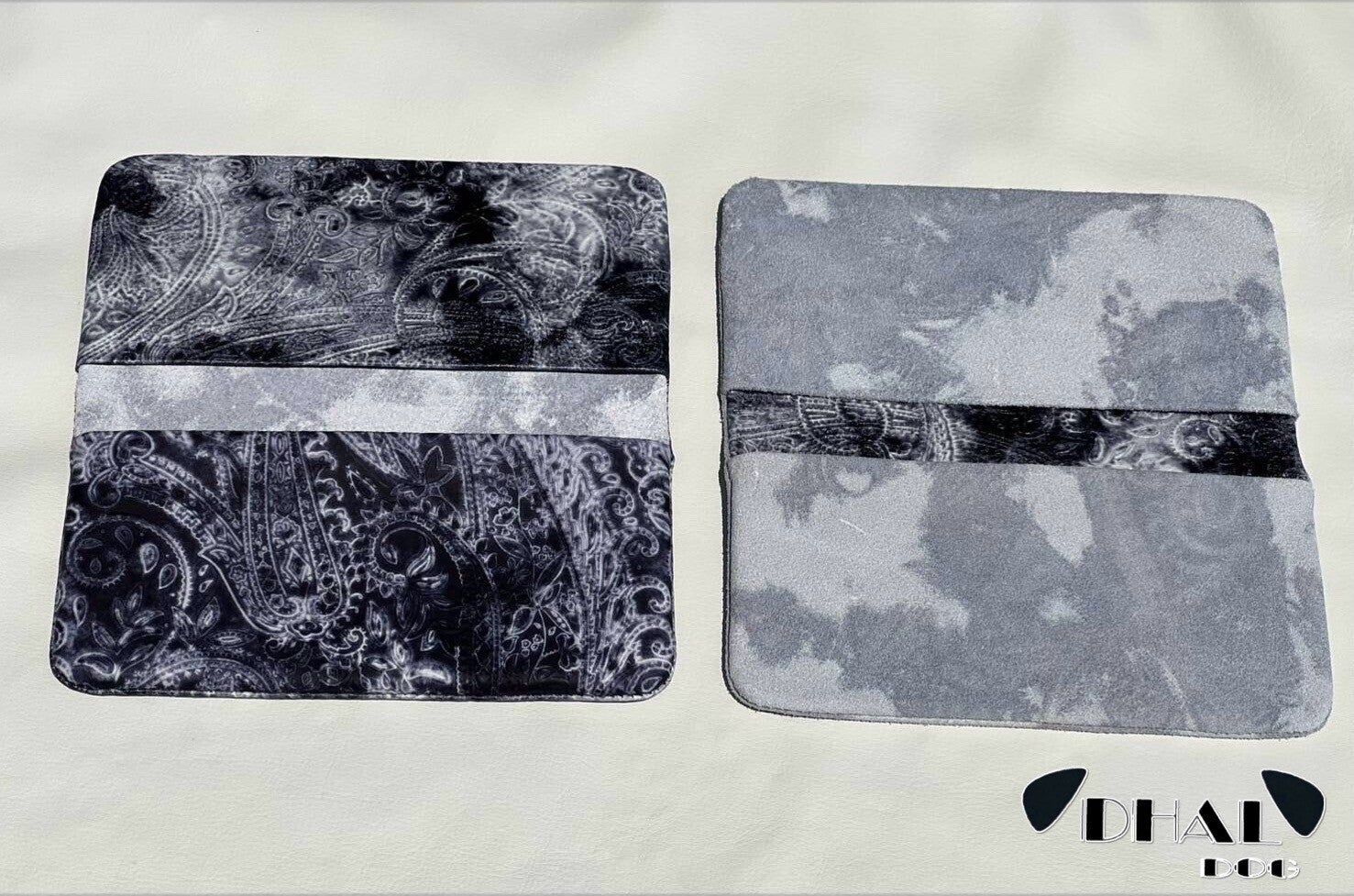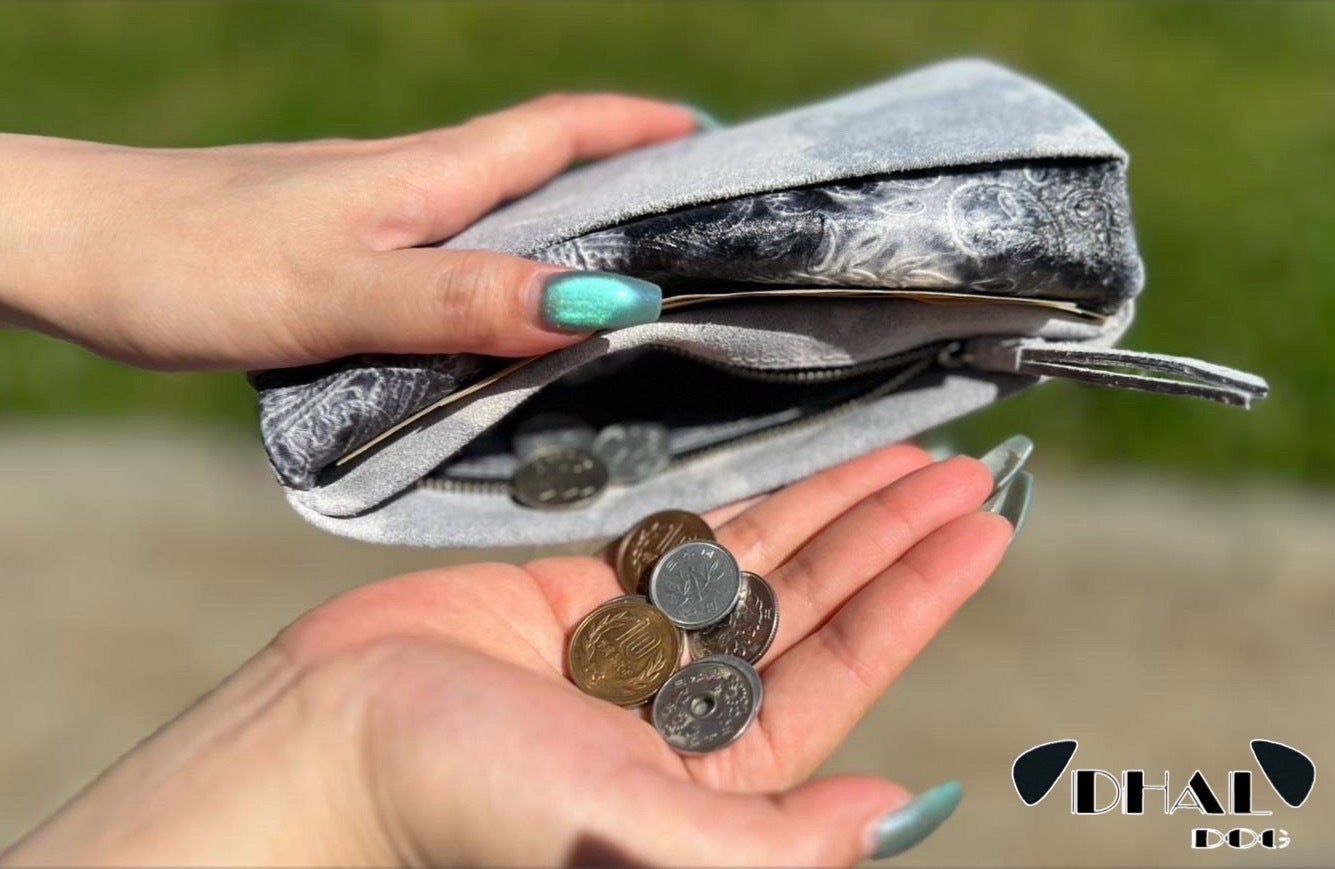 今回、「DHAL.DOG」の革の特徴であるダルメシアンカラー(裏)を使いロングウォレットとカードケースを製作しました。