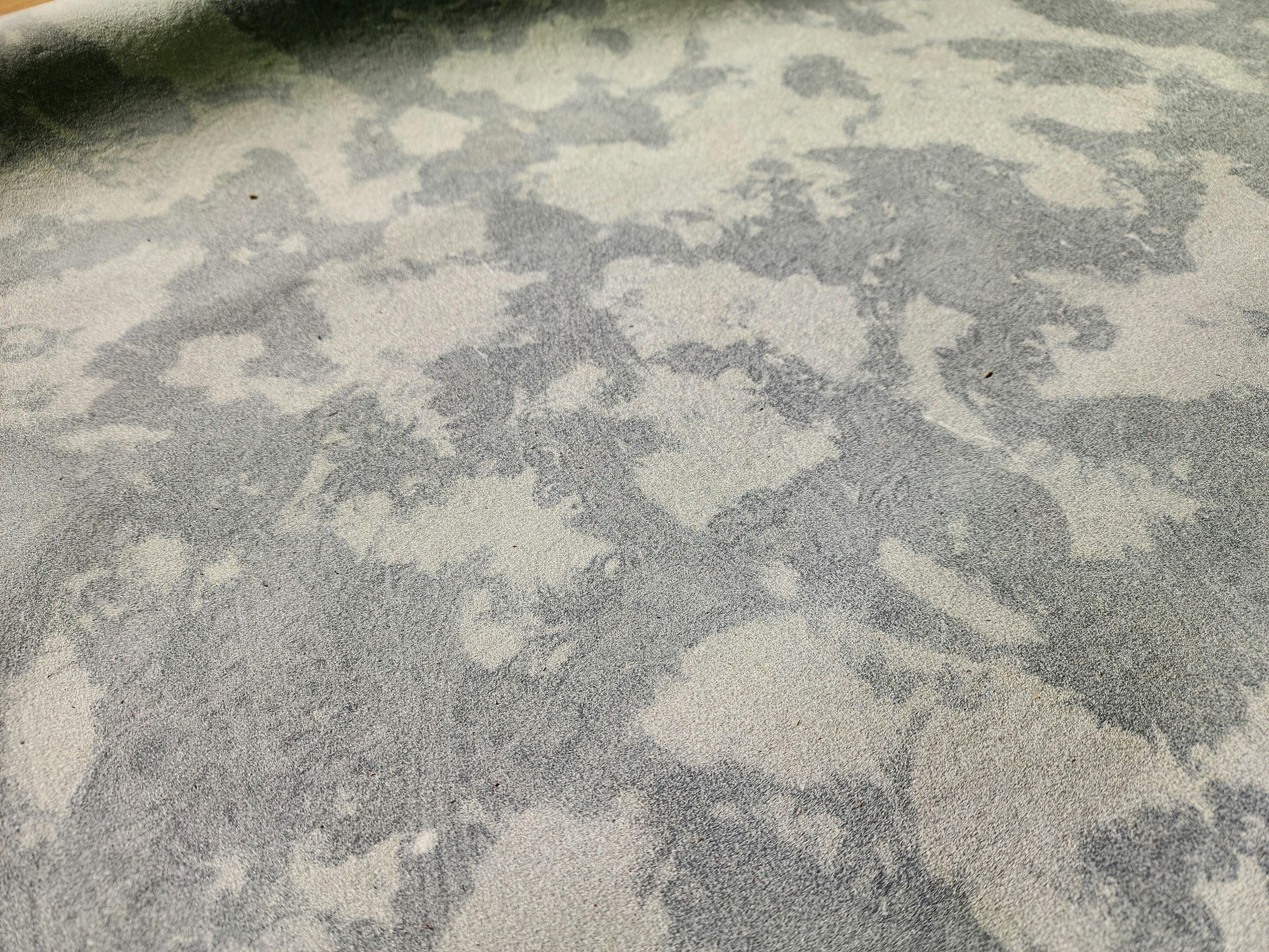 デットストックとなっている皮に、かわいいペイズリーの型を押します。次に黒く塗料を吹いて乾いたら、ここからが、「こだわりの手作業」がはじまります。職人のセンスが問われる工程。ある薬品をかけると黒い部分が、白くなっていきます。白と黒のバランスをとりながら薬品をかけて丁寧に仕上げていきます。同じ皮が出来ることはなく、1枚の皮の中でも同じ表情の部分はありません。皮も耐久性を考え、できるだけ薄く漉きをかけ、軽くて丈夫な厚さを考えてます。