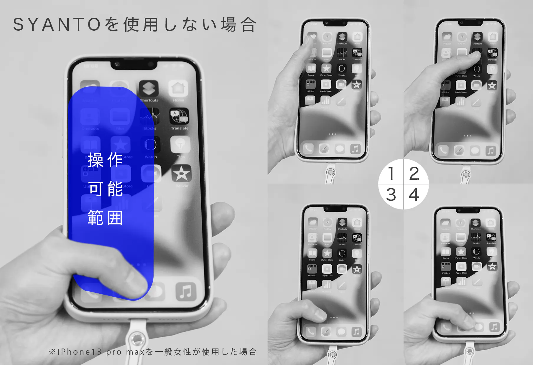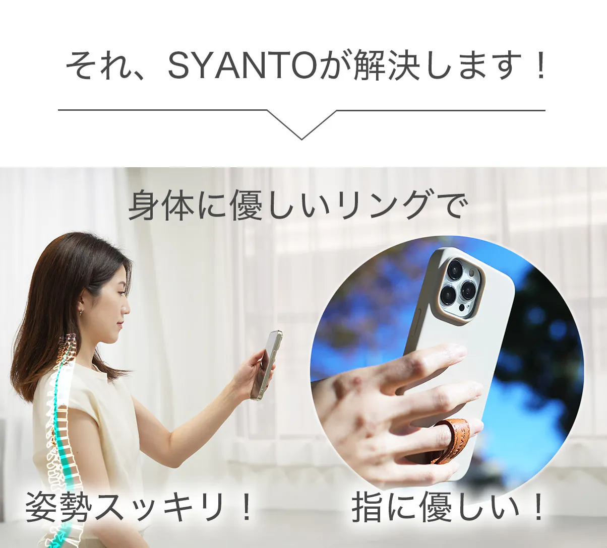 人間工学の知識を深めた『鍼灸師』が考案した、吊るして持つ全く新しい構造のスマホリングが『SYANTO』です。