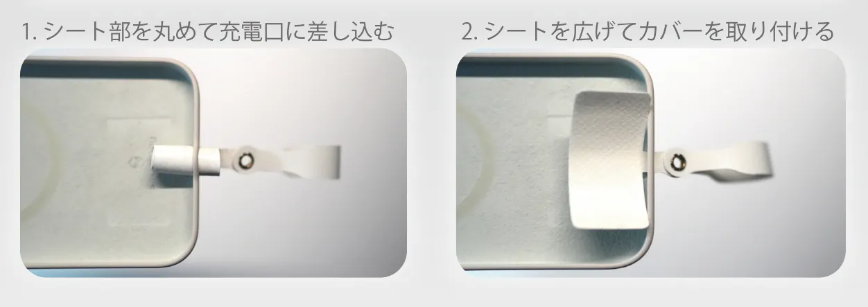 取り付けはとても簡単でシート部分を丸めてケースの充電口から入れるだけ。
