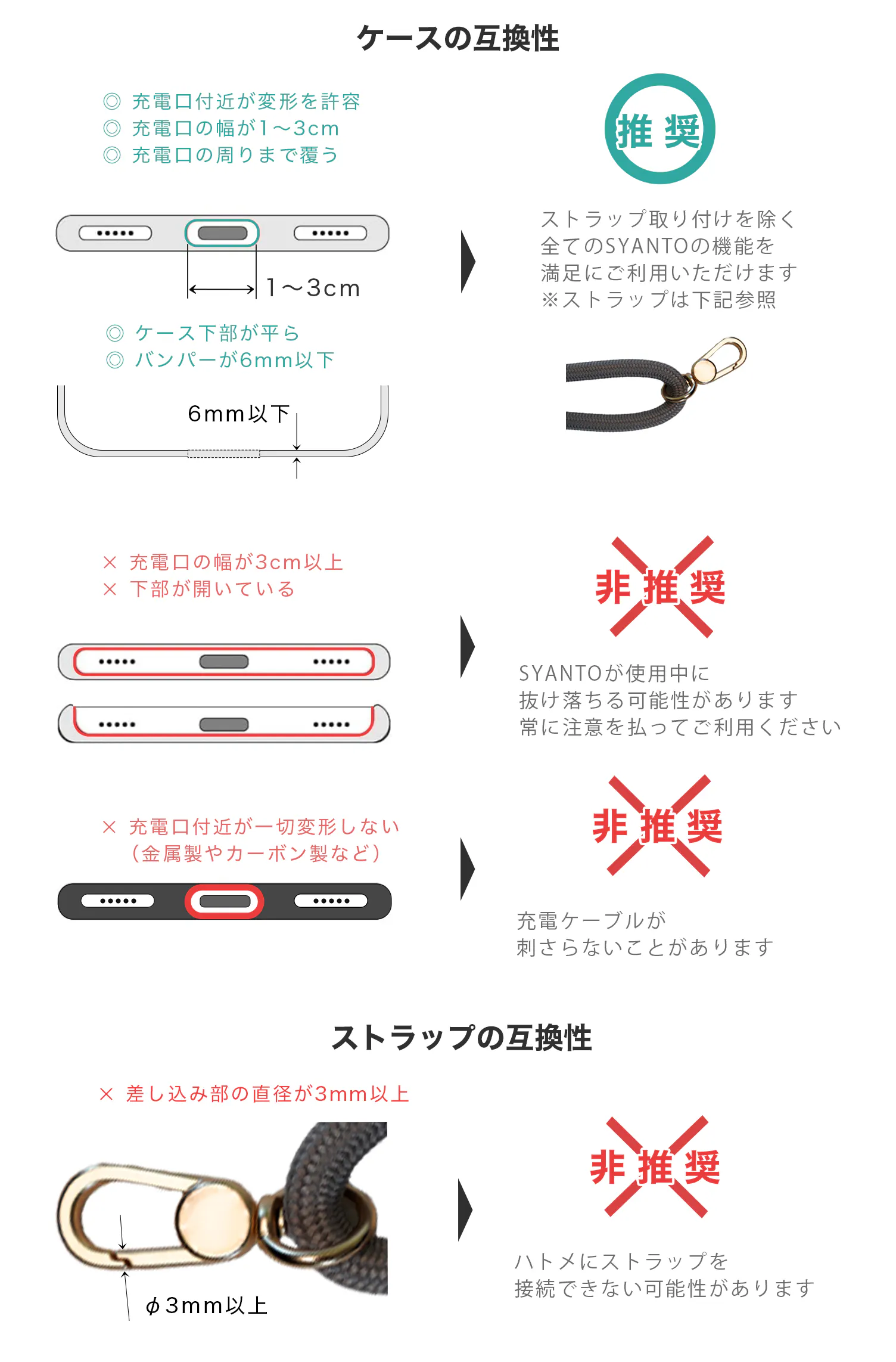 SYANTOは様々な機種やケースに対応できるように設計されています。一部対応できないケースがございますので、事前によくご覧になるようお願いいたします。
