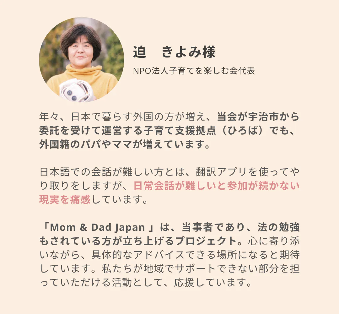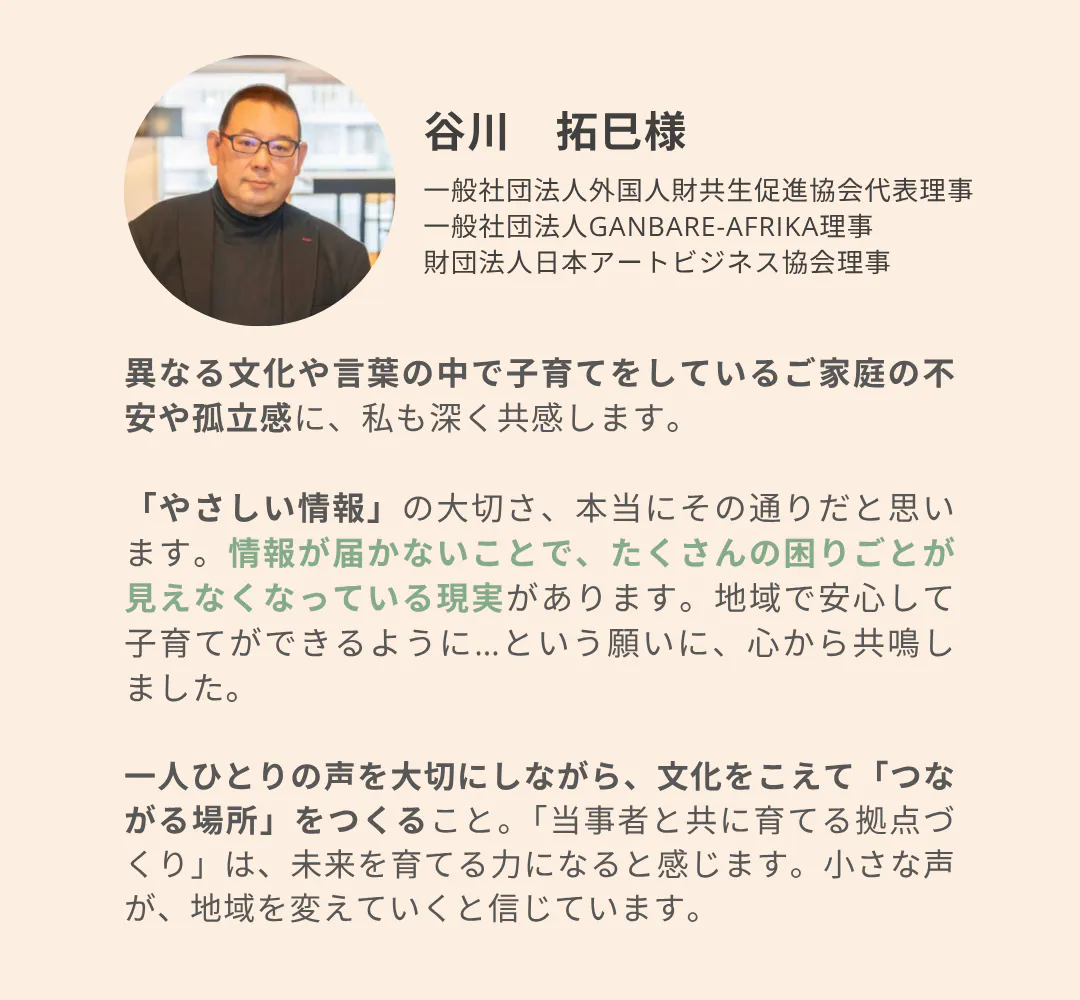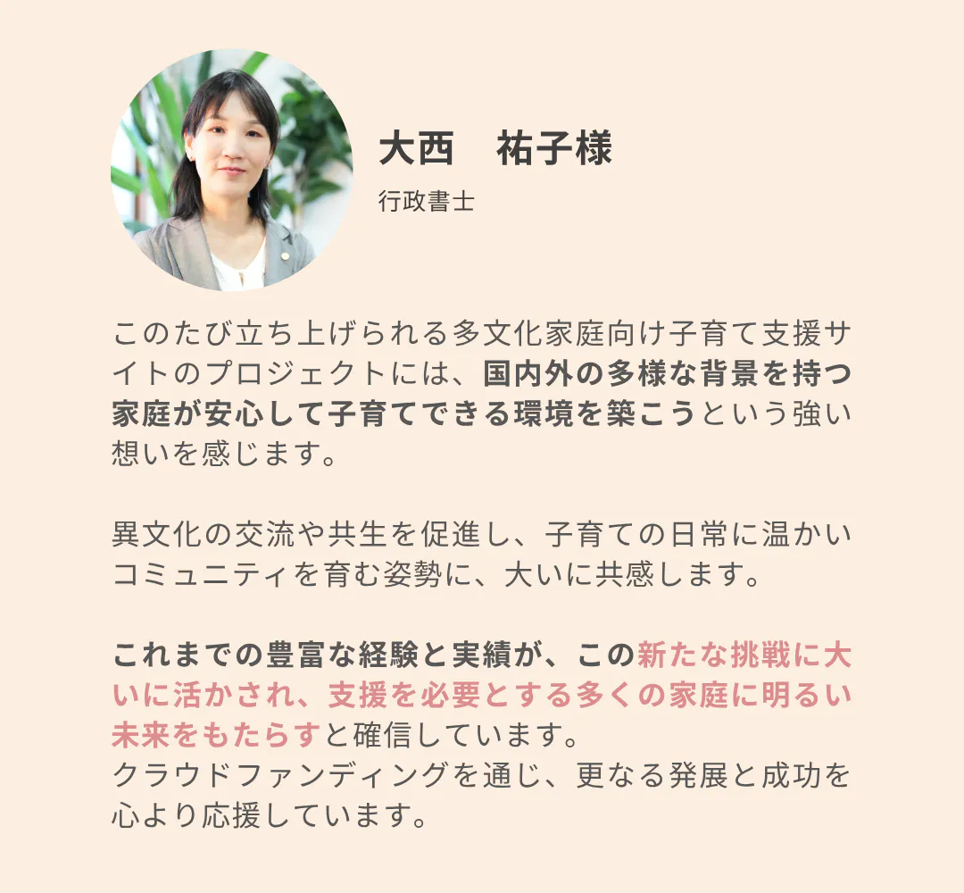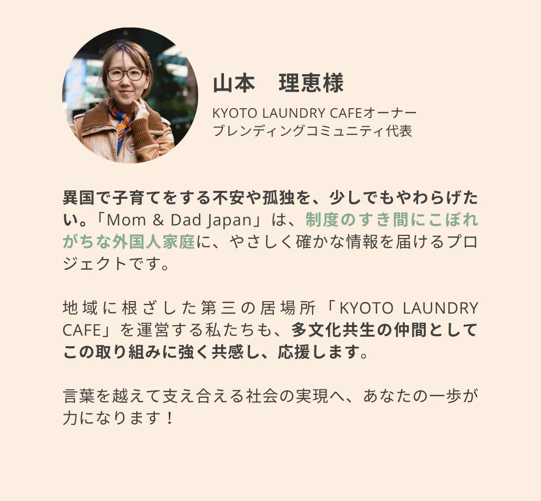 言葉や文化を越えて、同じ立場の親どうしが支え合える社会を目指して──このプロジェクトを、皆さまとともに育てることができますと幸いです。