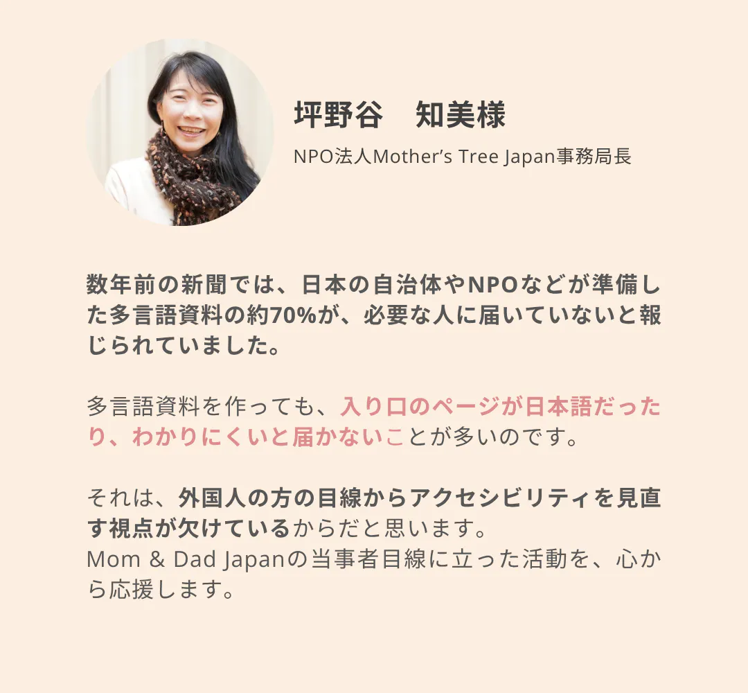 2025/09/21 09:00みなさん、こんにちは!Mom & Dad Japanプロジェクト(以下MDJ)を応援いただきありがとうございます。クラウドファンディング開始から日が経ち、現在【40万3千円/目標55万円】、達成率【73%】となりました!ここまでご支援・ご拡散いただいた皆さまに、心から感謝申し上げます。ここで少し、皆さまからいただいた質問にお答えしようと思います。もし「こんなことを聞きたい!」という質問があれば、ぜひコメントやメッセージでお寄せください。Q1: 「誰でも閲覧できるウェブサイトで、日本の公的システムの情報が簡単に手に入るのはリスクがある気がします。悪用されて日本の文化が壊れないか心配です。」→ 情報公開の範囲については、しっかりと管理しています。特に重要な情報についてはフィルタリングをかけ、また、一部の情報は有料にすることで、セキュリティ面でも対策を強化しています。Q2: 「サイトの表示は英語だけ?」→ あえて全て英語で表示します。日本語から単純に翻訳するだけではなく、英語非ネイティブの方にも分かりやすい「やさしい英語」で情報を提供します。支援者のプロフィール紹介今回は、特にユニークなバックストーリーを持つ支援者様をご紹介します!NPO法人Mother’s Tree Japanの事務局長を務める坪野谷さんは、東京都豊島区で出産を控える外国人女性の相談を受けています。Mother’s Tree Japanでは、カウンセリングや付添サービスを提供し、在日外国人女性が安心して子育てできるようサポートしています。坪野谷さんは、乳児保育の保育士や、マッサージをしながら産後の女性の話を聞く仕事をしてきました。8年前、日本で暮らす外国人の母親の悩みを知り、言葉や文化の違いに戸惑う女性たちを支援したいという思いから、助産師が入院前の準備を教える機会を設けました。専門用語をわかりやすく伝えるため、各国の通訳が協力しています。彼女の目指す未来は、“外国人女性も安心して子どもを産める社会”です。その情熱は、私たちのプロジェクトにも多くのインスピレーションを与えてくれています。Mother’s Tree 公式サイト- - - - - - - - - - - - - - - - - - - - - - - - - - - クラウドファンディング終了まで、残すところ一週間。たくさんの方に後押ししてもらい、プロジェクトに対する期待や責任も感じています。期待に応えられるよう最後まで走り切ります!引き続きのご支援・応援、どうぞよろしくお願いいたします!MDJチームより もっと見る