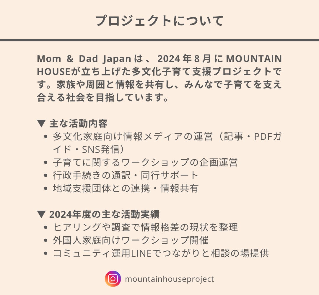 2025/09/29 18:00このたび、Mom & Dad Japanのクラウドファンディングが無事に終了いたしました。まずは、ご支援してくださった皆さまに、心から感謝申し上げます。今回のプロジェクトには、国内外から合計48名の方々がご支援を寄せてくださいました。そのうち約85%は日本国内からのご支援であり、地域の皆さまが国際的な家庭を支えようと手を差し伸べてくださったことに、深く感動しています!クラウドファンディングは、単なる資金調達にとどまらず、文化や言葉の壁を越えて「子育てを支えたい」という想いがつながる温かい時間になりました。結果のご報告別プラットフォームを含む合計⚫︎支援者数:48名⚫︎支援総額:¥666,872⚫︎支援者の地域内訳 日本:約85% 海外:約15% ( オランダ、アメリカ、フランス、カナダ、中国など )これからの取り組み皆さまからいただいたご支援を元に、Mom & Dad Japanは本格的に始動します。 以下のような活動を少しずつ形にしてまいります。⚫︎わかりやすい子育てガイドの制作⚫︎シンプル英語で文化的配慮のある情報発信⚫︎多文化ファミリーのリアルな声の紹介多様な方々を巻き込みながら、「だれもが孤立しない子育て環境」の実現を目指してまいります。今後の活動の様子は、Instagramや公式サイトで随時発信してまいります。▶︎ Instagram MOUNTAIN HOUSE Mom & Dad Japan▶︎公式サイトあらためまして、温かい応援を本当にありがとうございました。MDJチームより もっと見る支援者との交流 & フィードバック募集