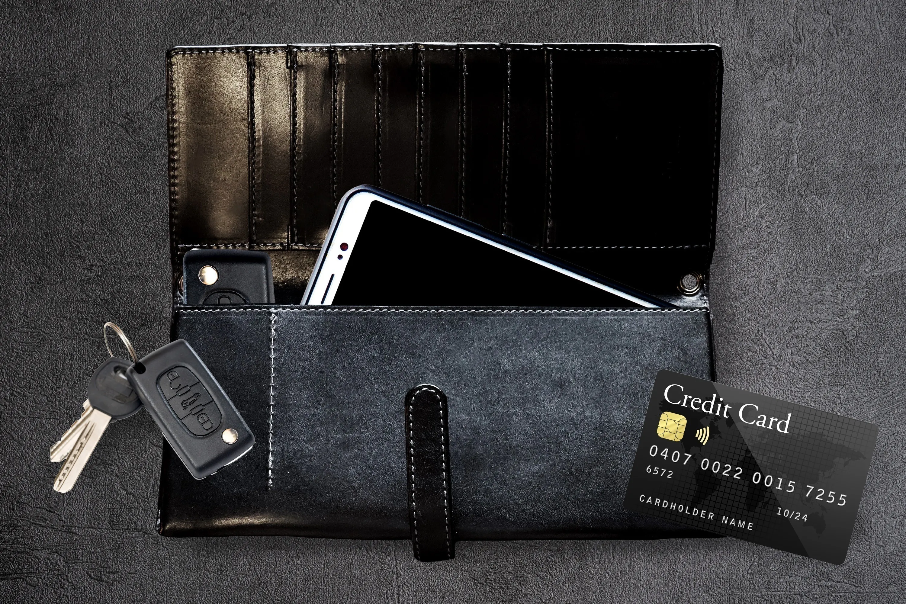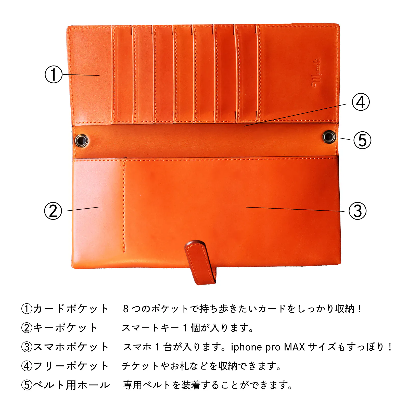 スマホポケット、カードポケット×8つ、キーポケット、フリーポケットの4つの機能を搭載。