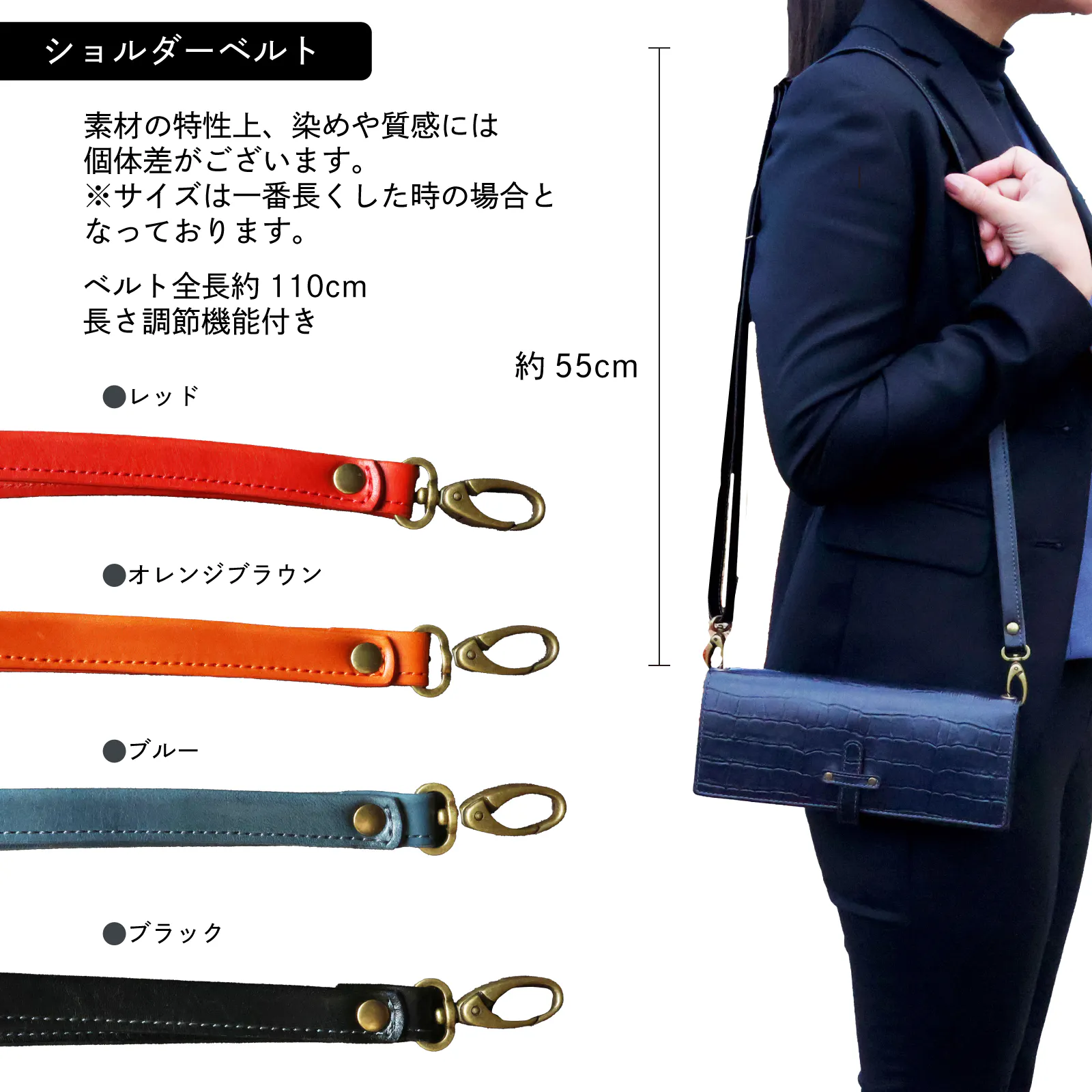 ショルダーベルトは、お好みに合わせて選べる4色展開。