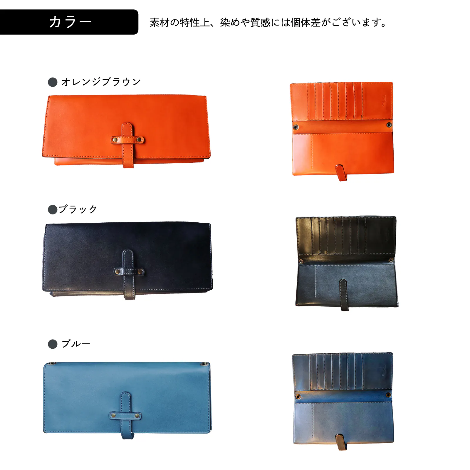 染め色の異なる美しい本革の表情と手触りの違い、使い込むことで異なるエイジングをお楽しみいただけます。