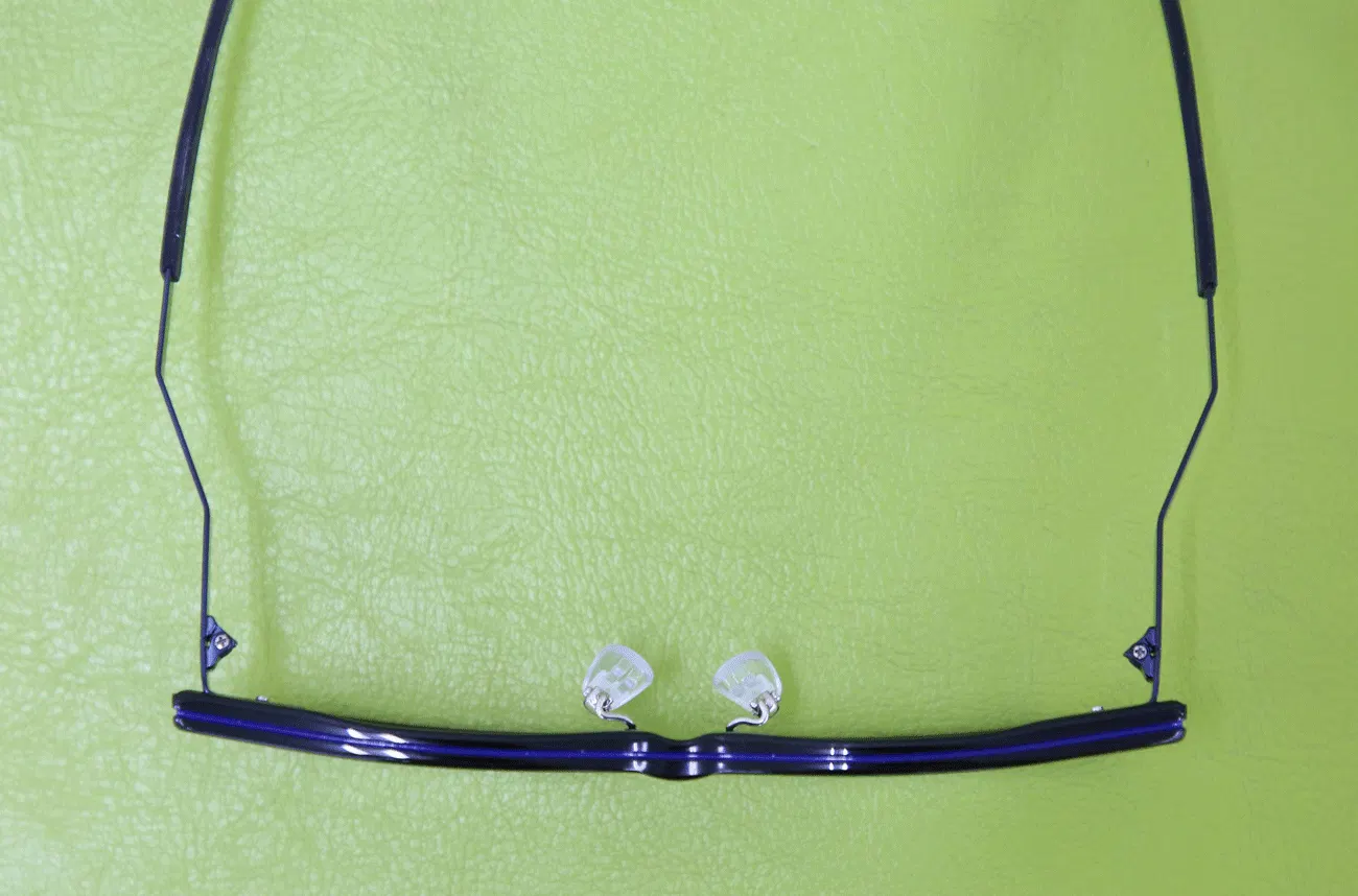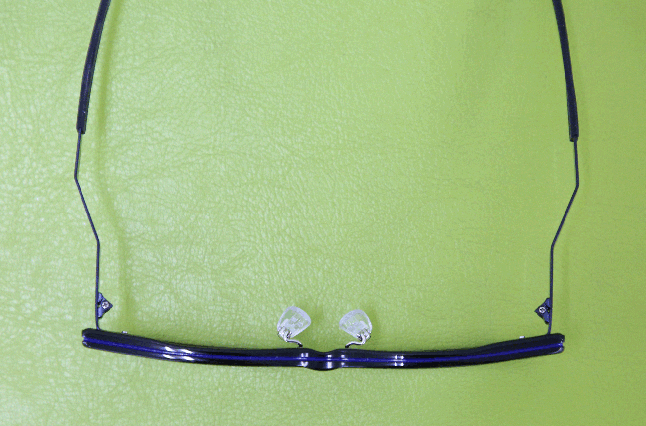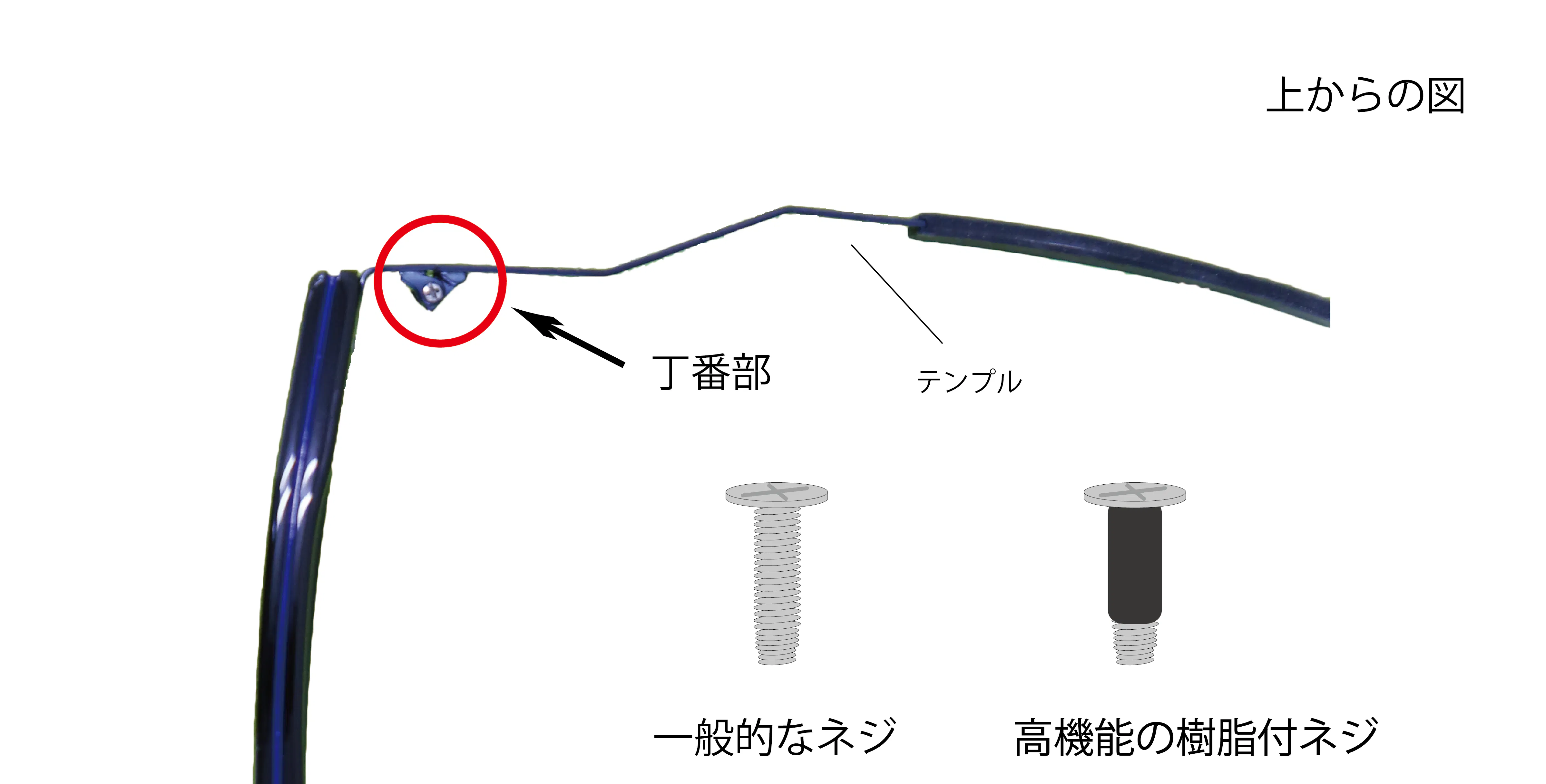 見えない部分ですがこのネジ1本外れるだけでメガネがかけれないという重要な部分です。出先で外れてしまって困ることを防ぐ為に樹脂ネジを採用しております。