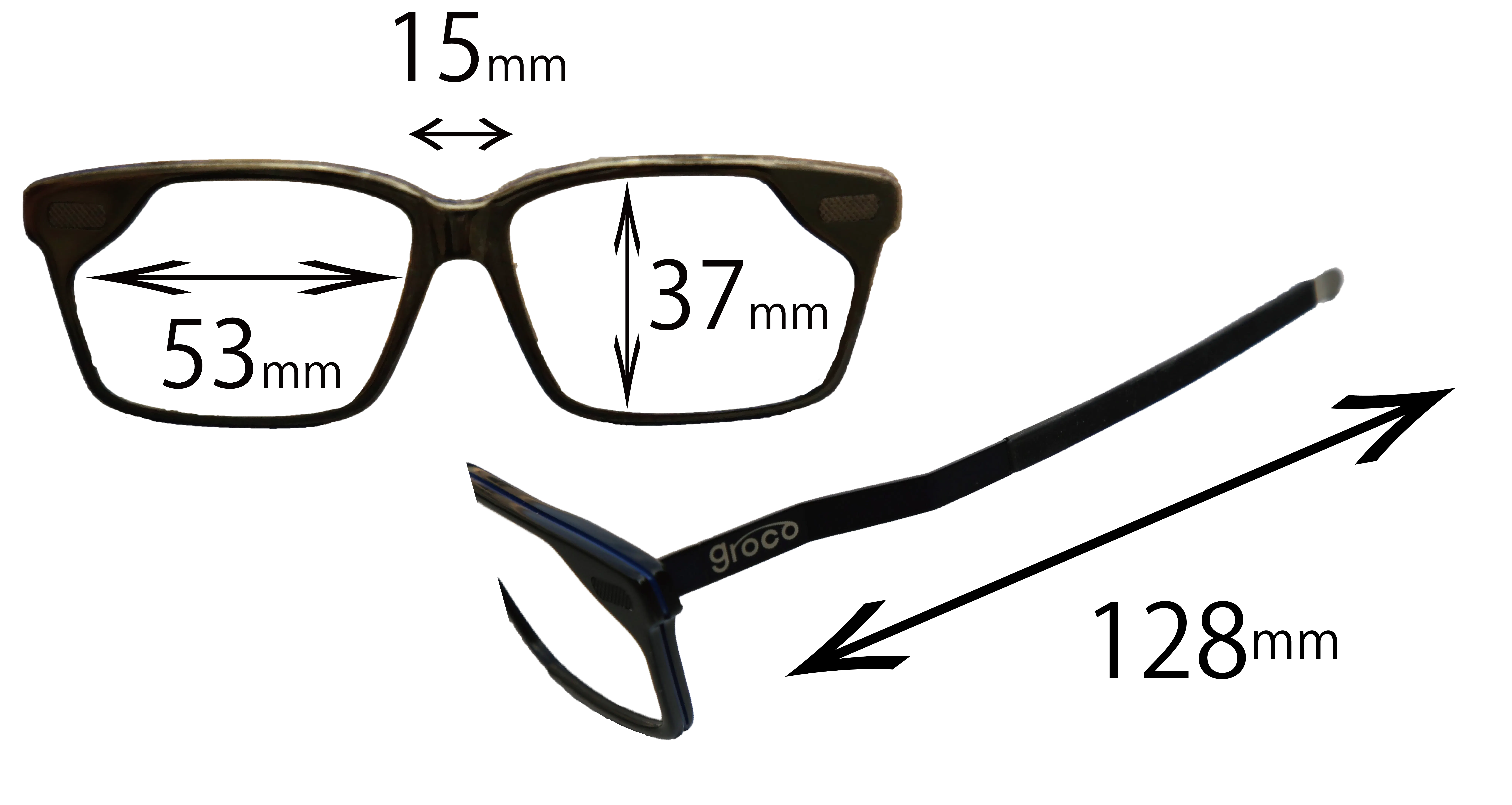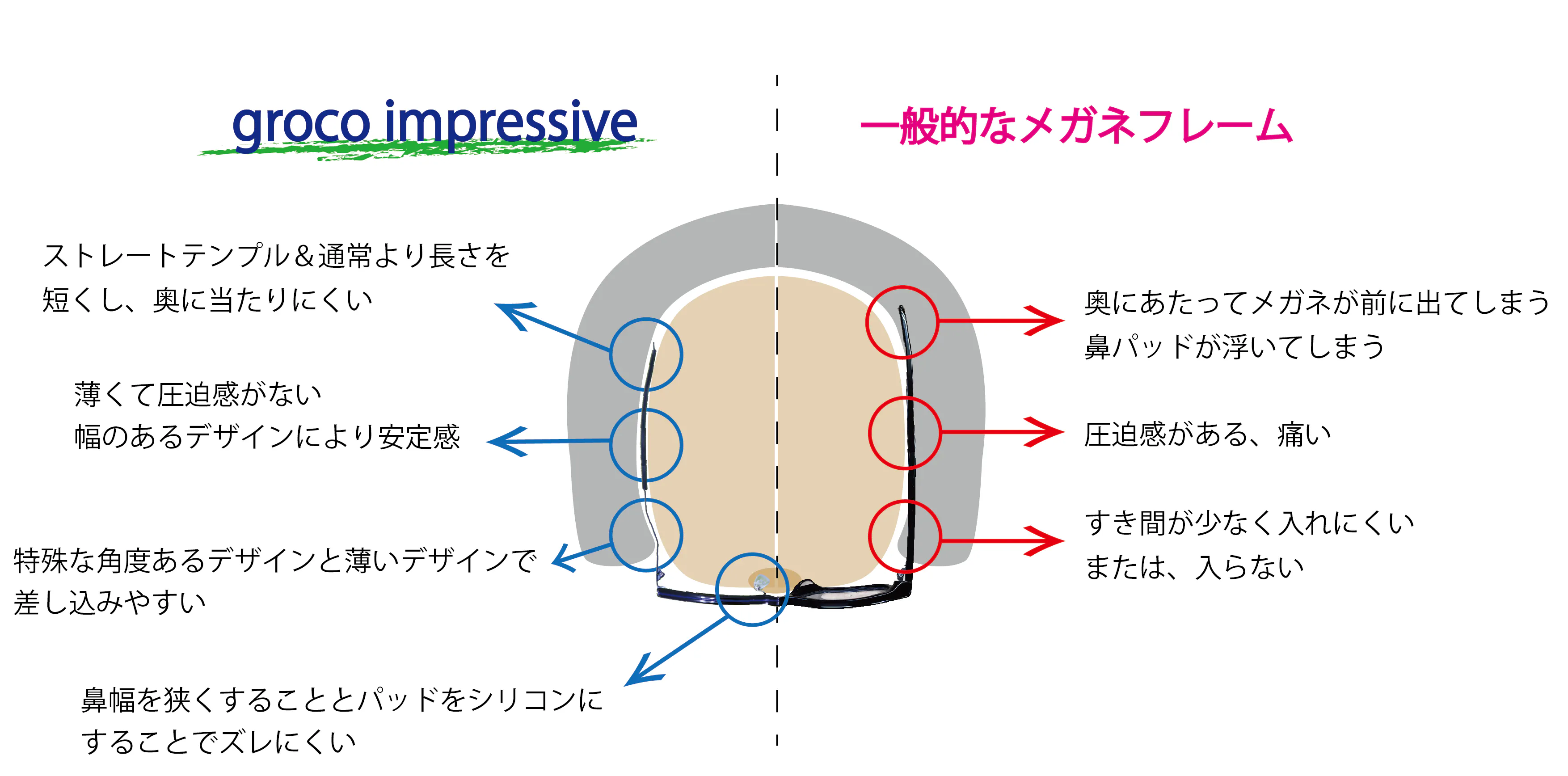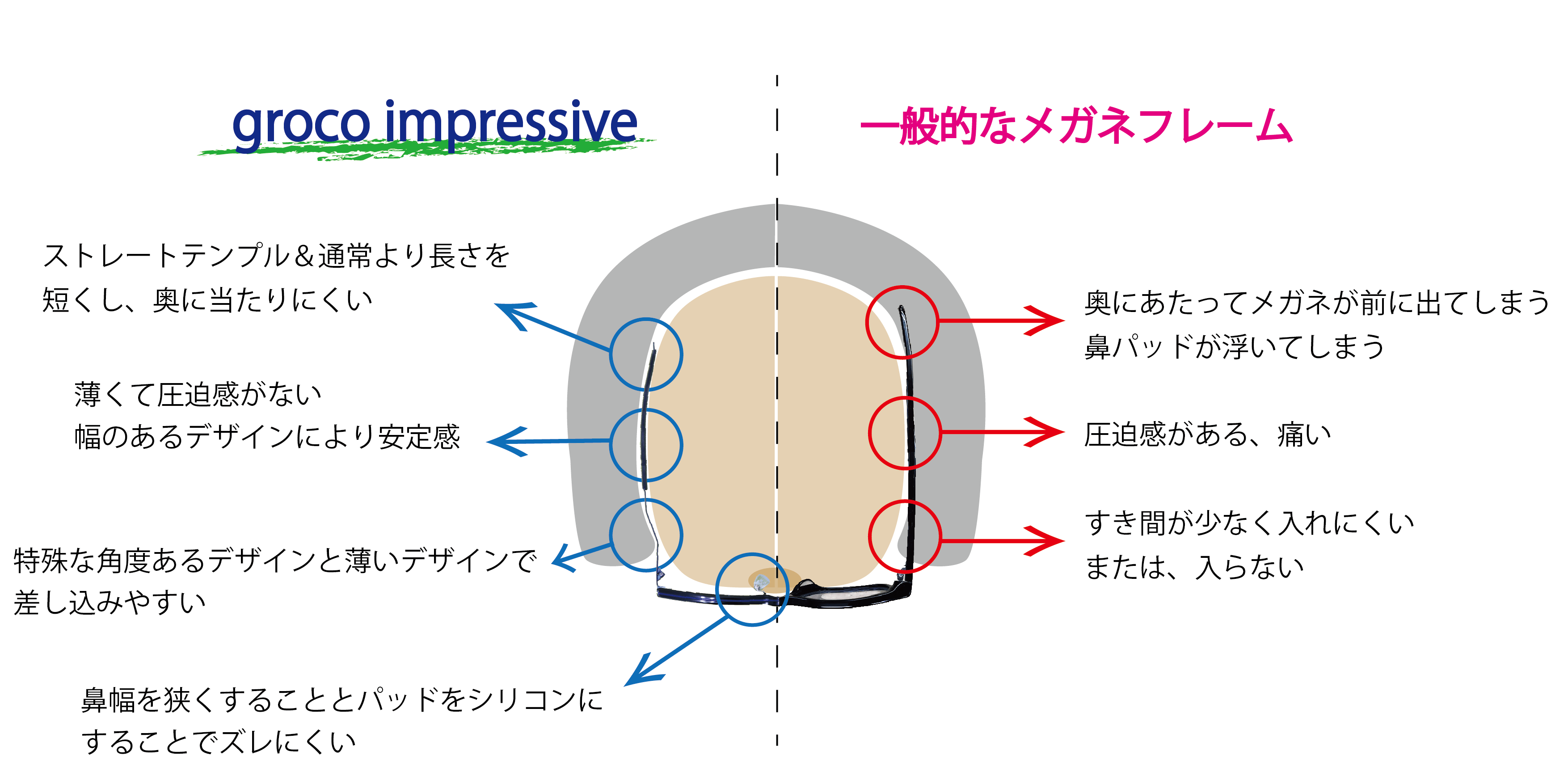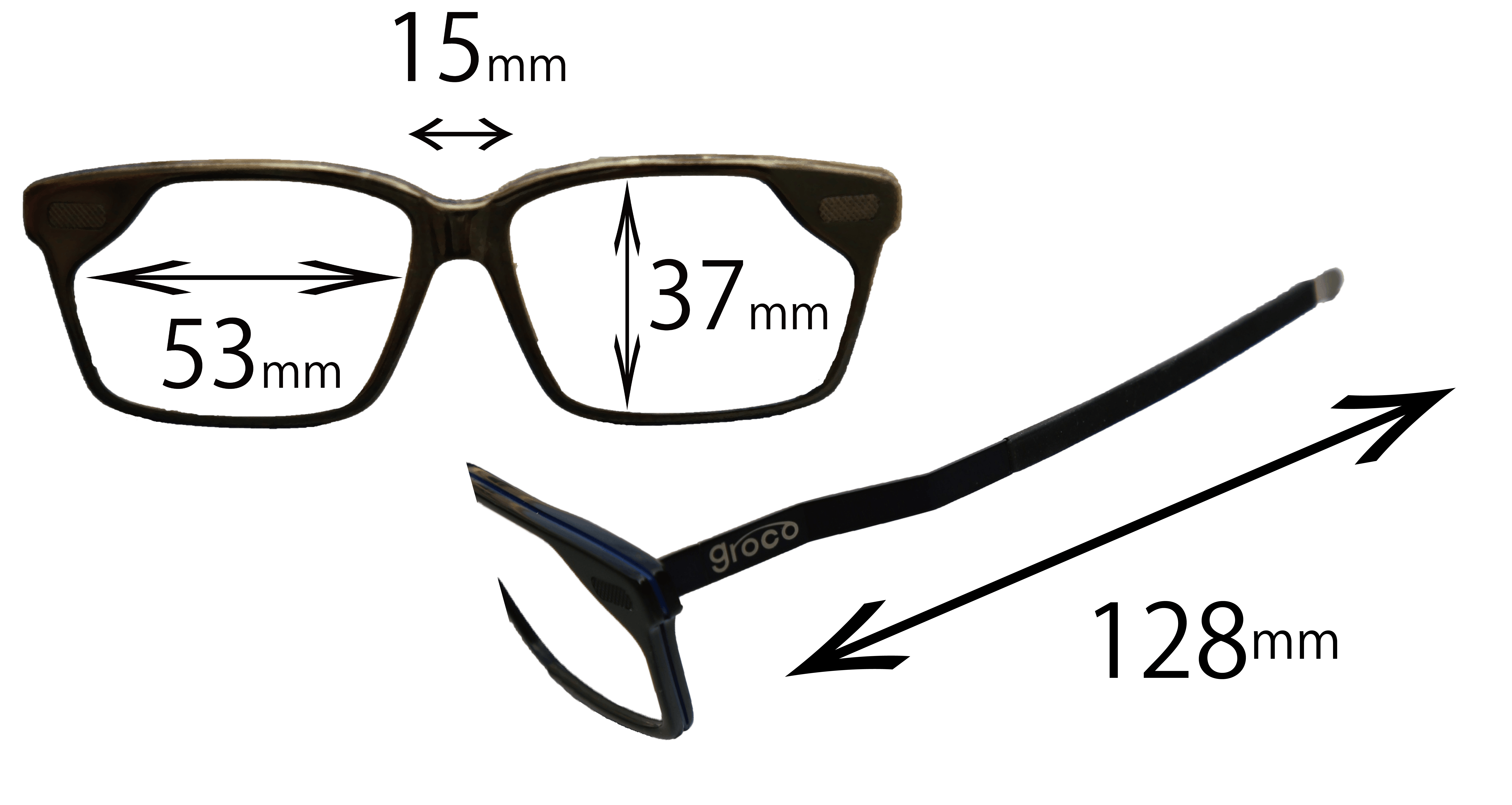 テンプルの長さは一般的な長さは140~150mmに対し、groco impressive は128mmに設定。