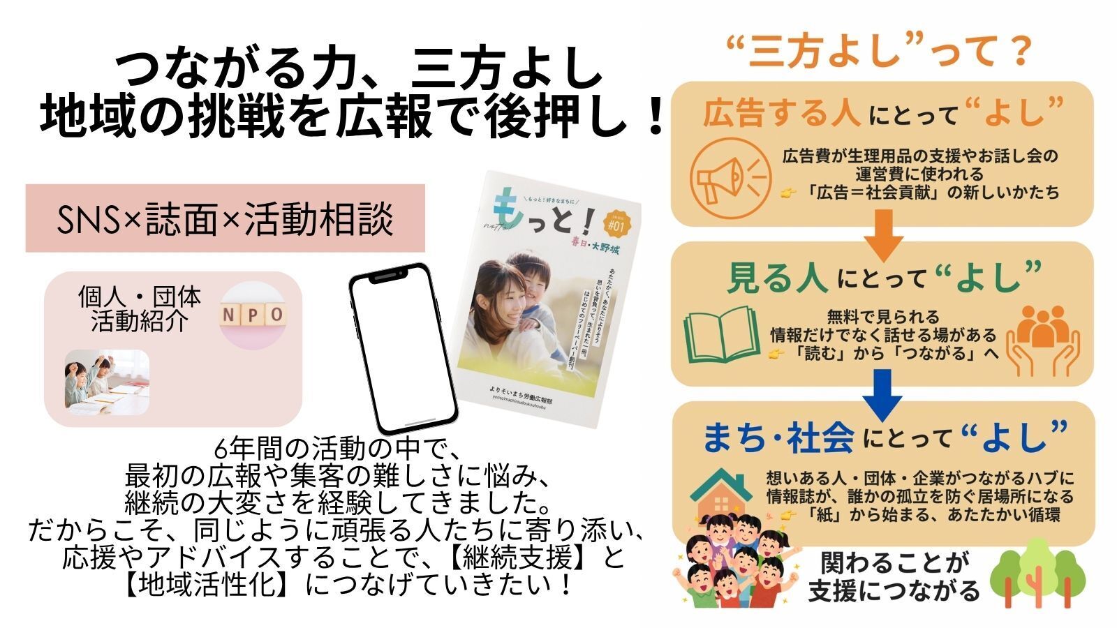 情報と人、地域と家庭をつなぐ、あたたかい紙のメディア。それが、私たちの新しいチャレンジ『参加型情報誌「もっと!」』です。