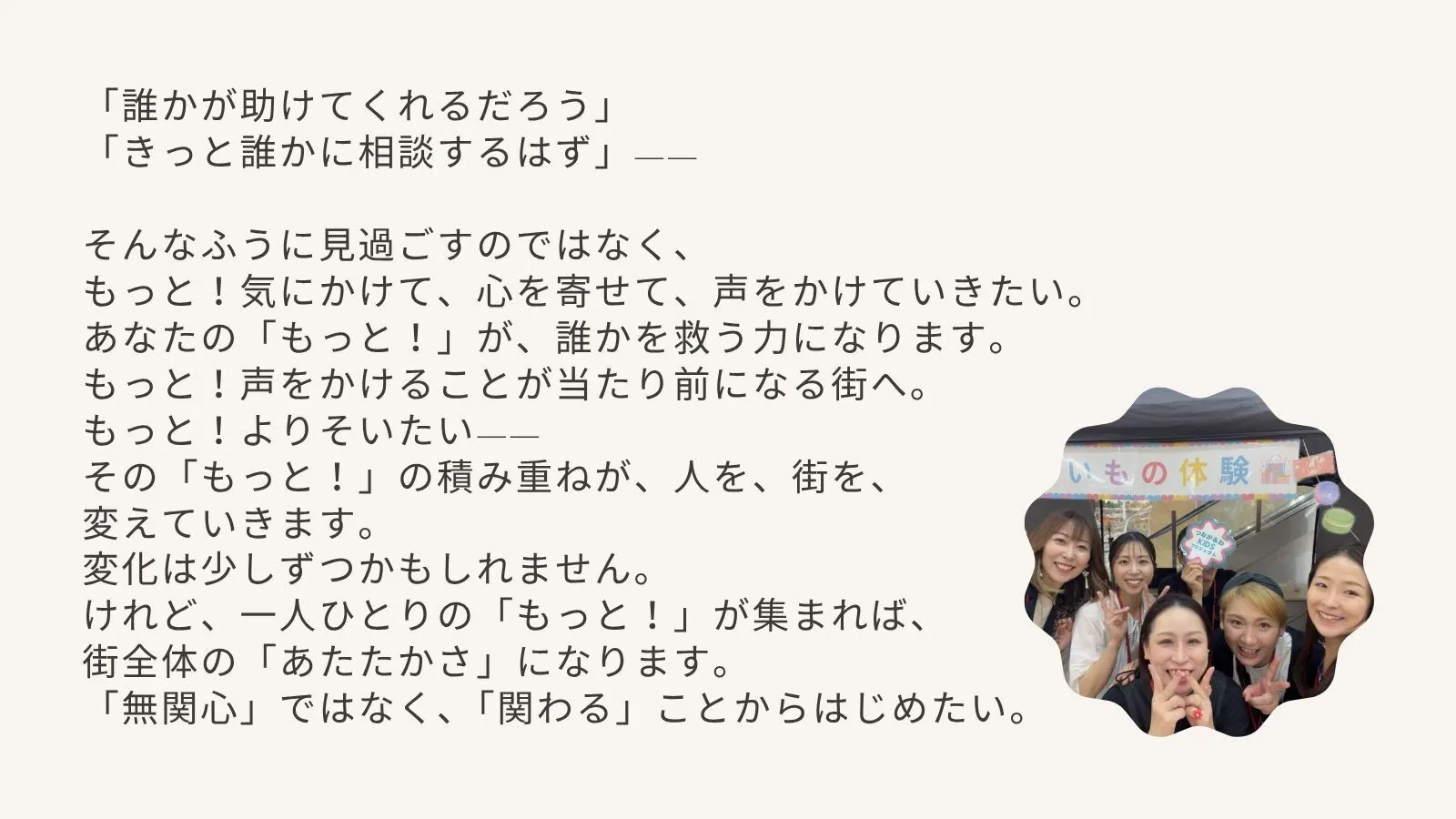 「無関心」ではなく「関わる」ことから始め、地域を元気に、孤独を感じない社会を目指していきたい。