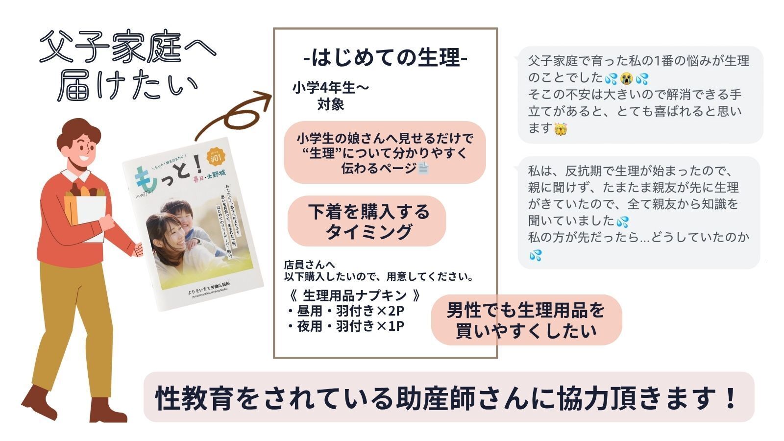 発行部数は毎号10,000部を予定、地域内約30ヵ所で無料配布します。内容には、行渋り・不登校・フリースクールなどのページ、発達障害のページ、防災ページ、小学生の「性」の特集、小学生にもわかりやすい生理のページ、父子家庭のお父さんが提示するだけで生理用品などを購入できるページなどを盛り込みます。(遠方の方へは、印刷して使用できるように無料ダウンロードできるようにします)