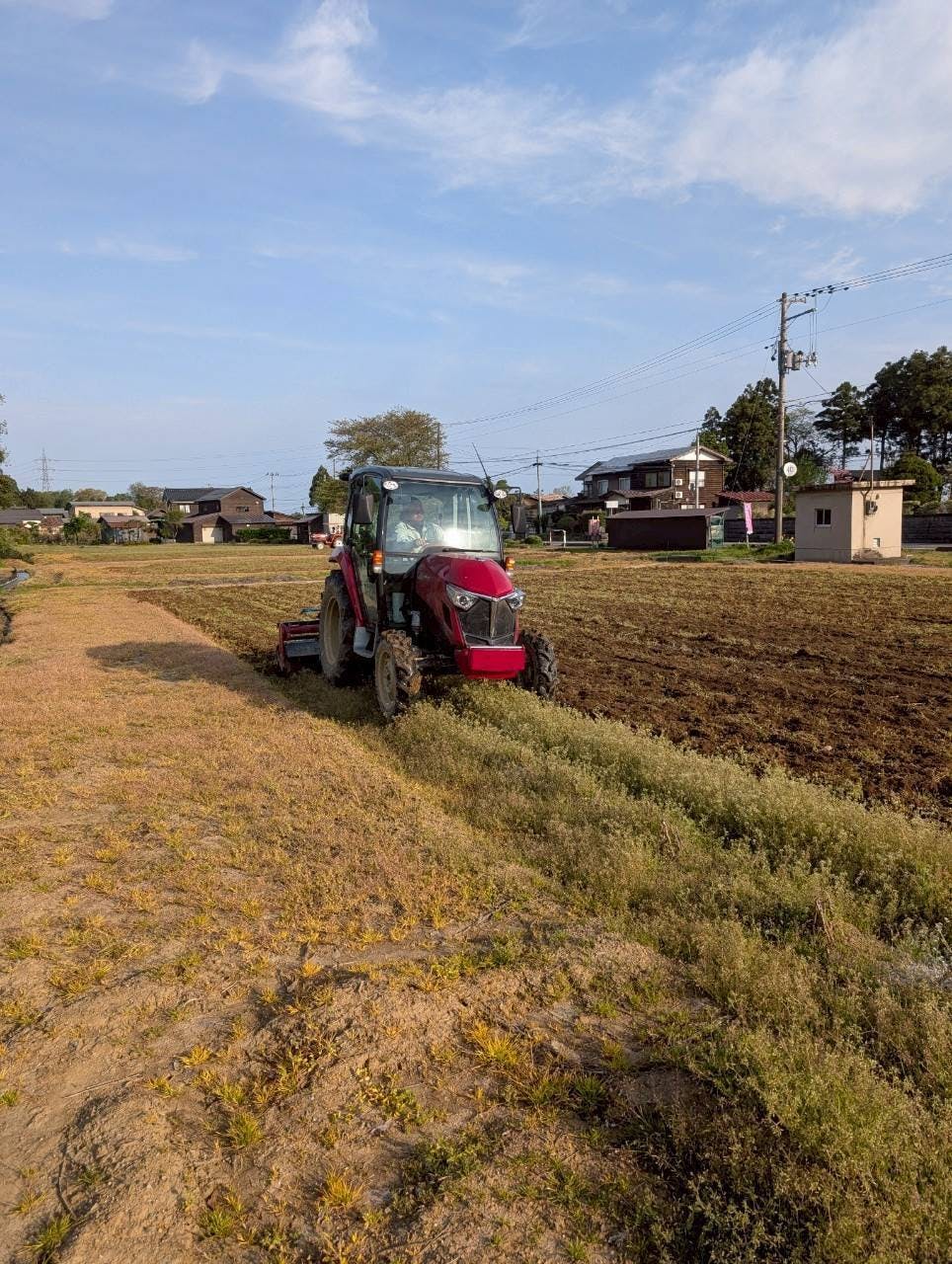 ■ 4月28日:株式会社だんらんで過去に大豆を栽培していた畑を、メンバーの渡部友一さんが重機で耕うんしてくれ、耕うん後に肥料を散布