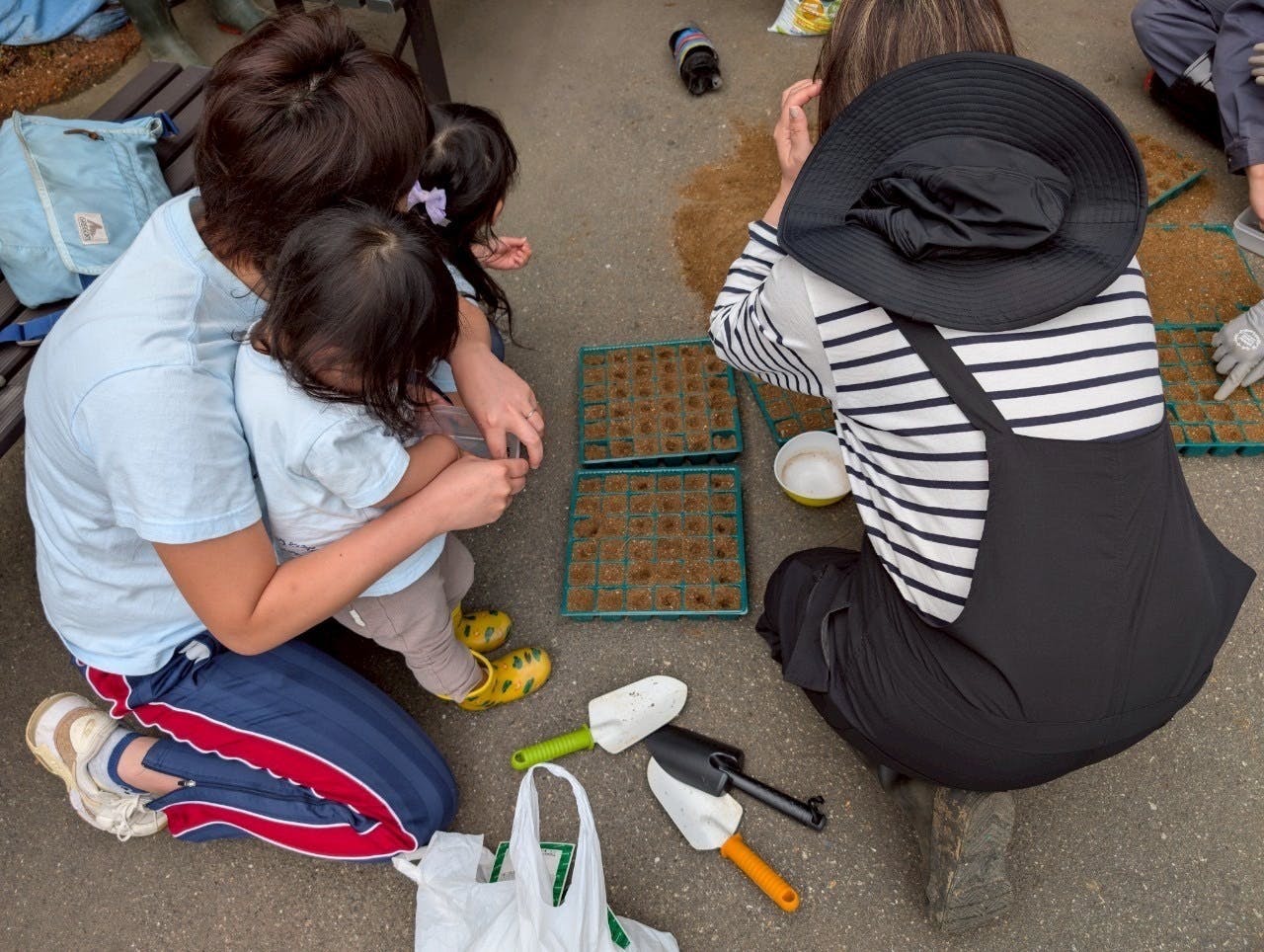 苗の育ちが悪いことを相談したところ、えちご上越農業協同組合頸城支店様より、かぼちゃ、別品種のなす、千宝菜の種を、また糸魚川市の方からは落花生の種を提供いただき、子どもたちを中心に楽しく種まきを行いました。