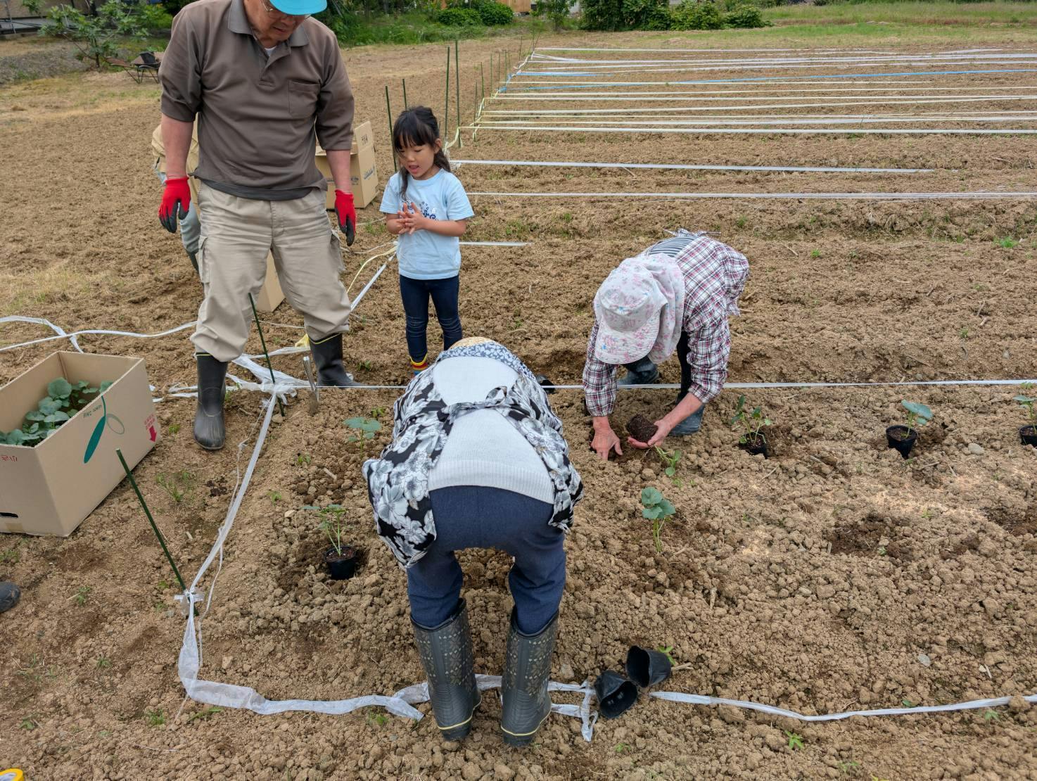 続いて、メインとなる苗の植え付け作業では、オクラ約80株、頸城オクラ約30株、なす約60株、とうがらし約30株を植えました。
